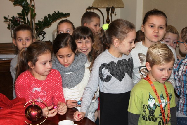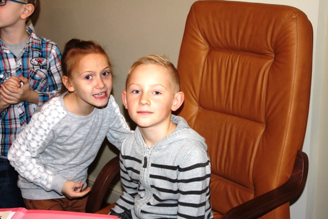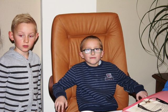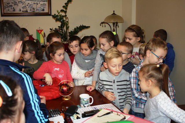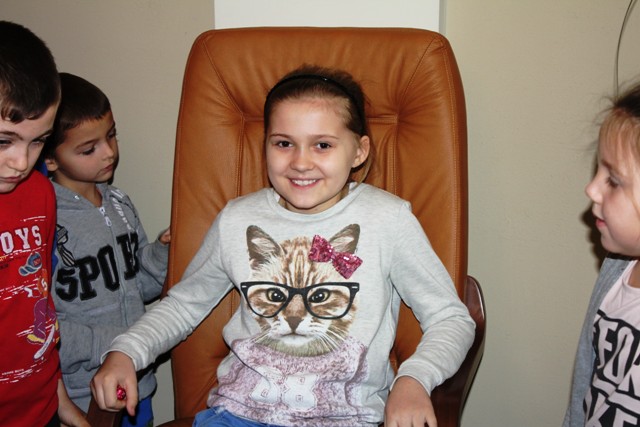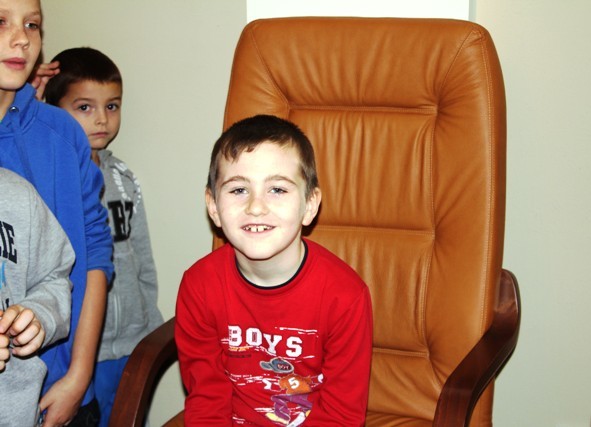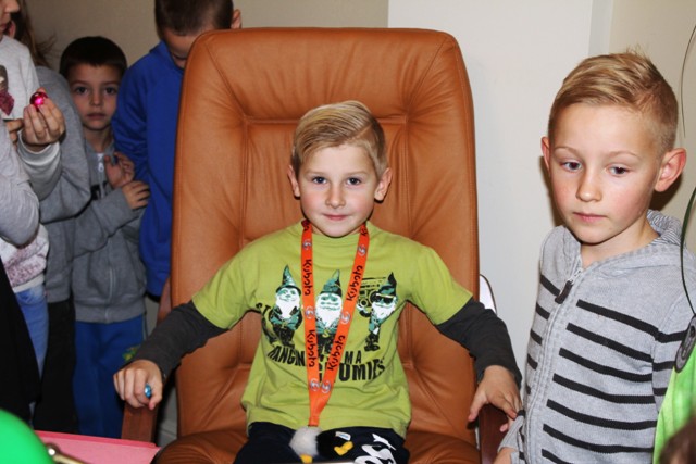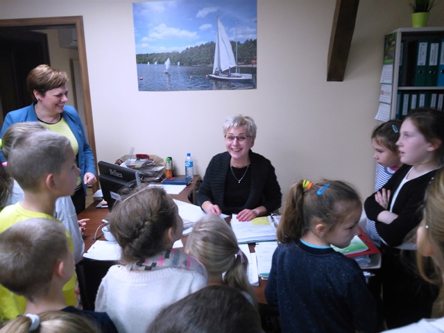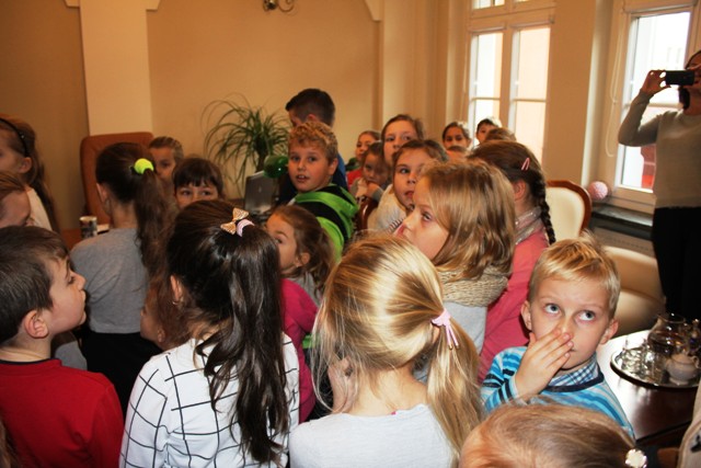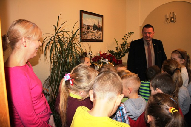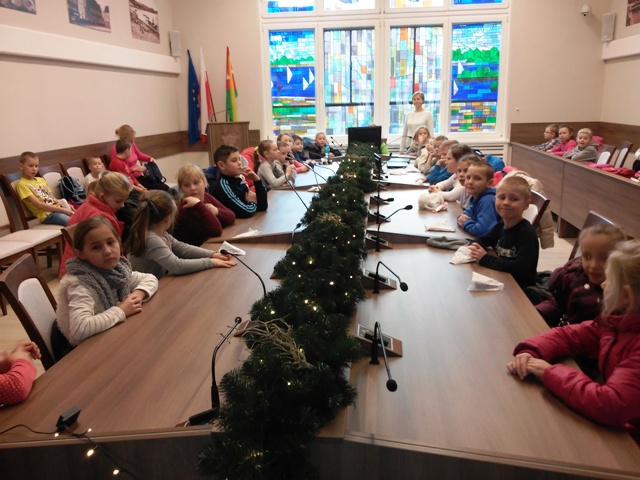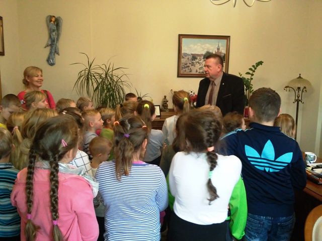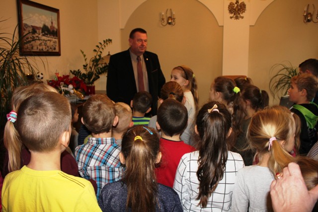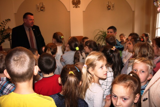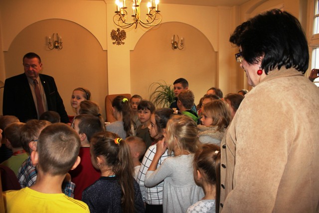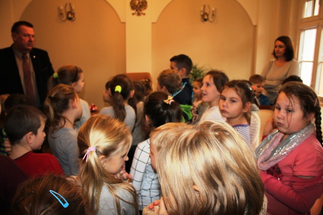 Następnie na uczniów czekała niespodzianka - wizyta w Urzędzie Miasta w Trzciance. Dzieci miały możliwość spotkania i rozmowy z włodarzem Trzcianki p. Krzysztofem Czarneckim. Dowiedziały się czym aktualnie zajmuje się Pan Burmistrz. Bardzo ucieszyła wszystkich wiadomość o planach budowy basenu i sali widowiskowej. Wielu naszych podopiecznych zadeklarowało przejęcie w nieco dalszej przyszłości fotela burmistrza. Duże wrażenie wywarła na wszystkich sala sesyjna, w której obradują radni oraz sala ślubów. Po zwiedzaniu każdy uczestnik otrzymał na pamiątkę długopis z logo naszego miasta oraz kalendarze do klas.