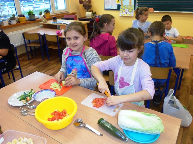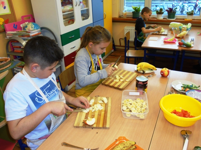 Za oknem ponuro i deszczowo... W takie dni łatwo o katar, przeziębienie i smutną minę. Dlatego, aby zachować zdrowie i radosny nastrój, uczniowie z klasy III samodzielnie wykonali zdrowe, kolorowe surówki. Od rana w naszej klasie unosiły się zapachy przyniesionych przez dzieci warzyw i owoców. Po umyciu rąk i założeniu fartuszków trzecioklasiści zamienili się w kucharzy. Wszyscy z entuzjazmem przystąpili do pracy. Po wykonaniu pachnących, pełnych witamin surówek, przystąpiliśmy do degustacji. Smakowały wyśmienicie!