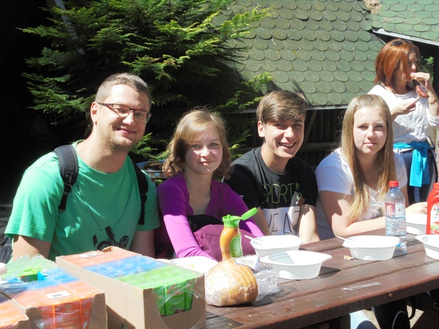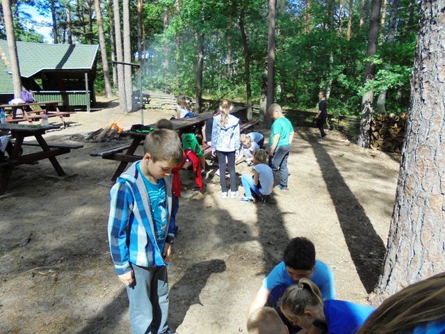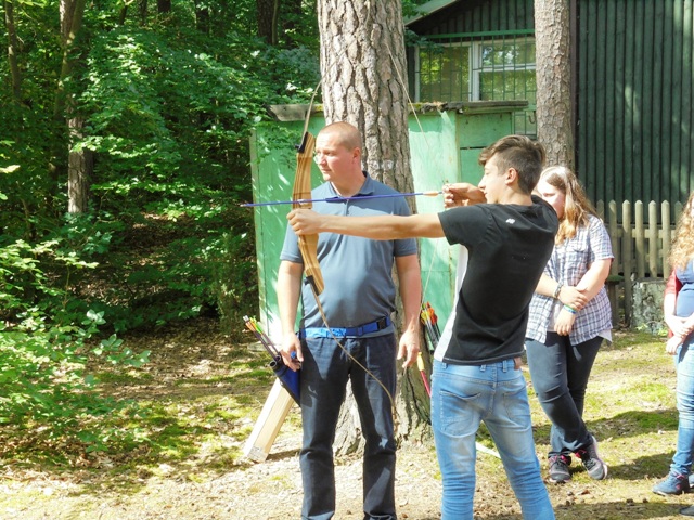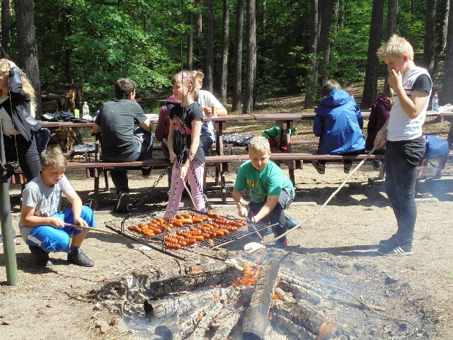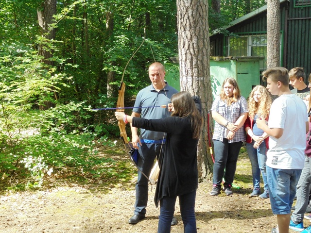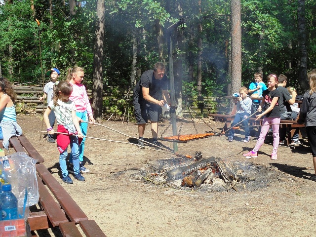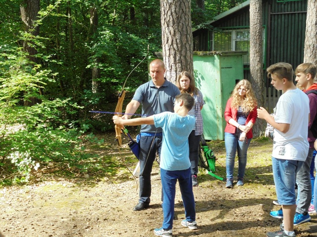Szczególną atrakcją była możliwość postrzelania z łuku do tarczy. Niektórym uczniom nawet nieźle szło… Po zwiedzeniu terenów strzelnicy smakowaliśmy kiełbasek upieczonych na ognisku.