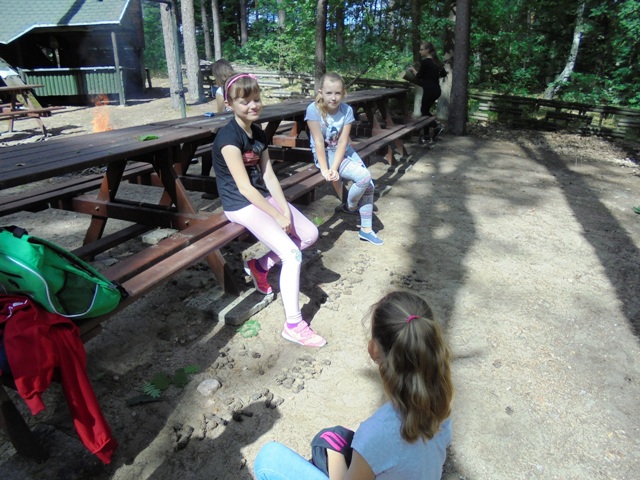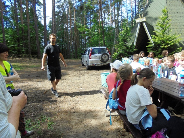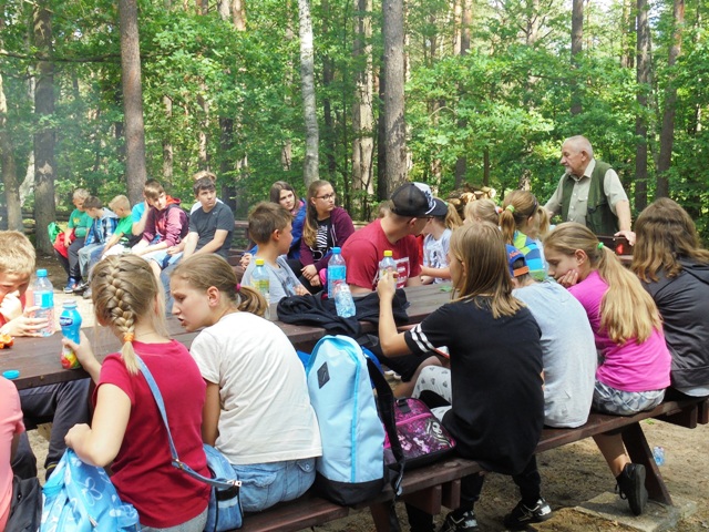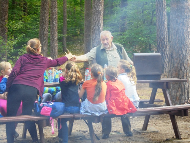 Przywitał nas miło p. Marek Komarnicki, który przedstawił nam pana Jackowskiego – wieloletniego leśniczego. Zgromadzeni wokół ogniska wysłuchaliśmy opowieści o zmianach pór roku w lesie, trudnej pracy leśników i zagrożeniach ze strony ludzi. Pan Jackowski nadmienił nam również o negatywnych skutkach wpuszczania psów i kotów do lasu, zwłaszcza stratach jakie powodują wśród zwierzyny leśnej.