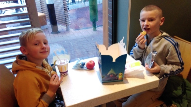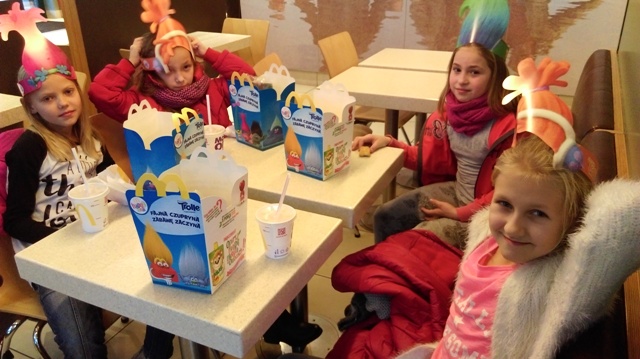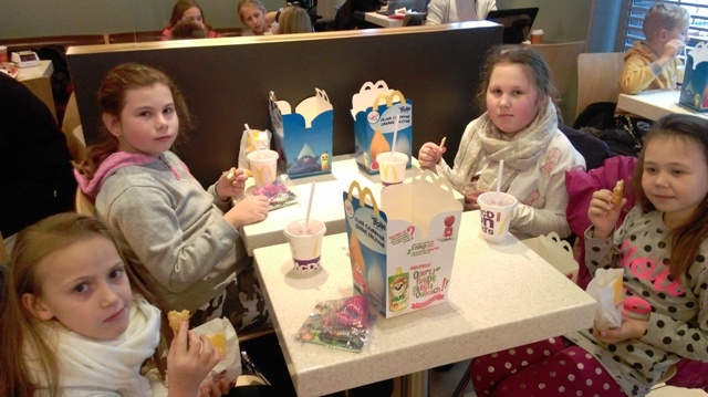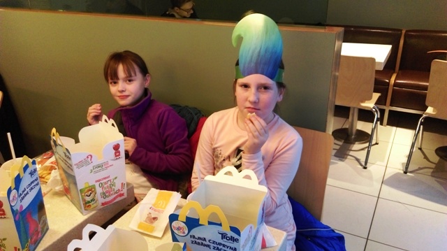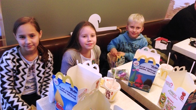 Po wytężonej aktywności fizycznej przyszedł czas na uzupełnienie spalonych kalorii. Trzeciaków czekała kolejna atrakcja w jednej z bardziej ulubionych sieci zbiorowego żywienia. Nakarmieni, po zaspokojeniu pragnienia i zaopatrzeni w kolorowe zabawki, wróciliśmy do szkoły, z pomysłami na kolejną wycieczkę.