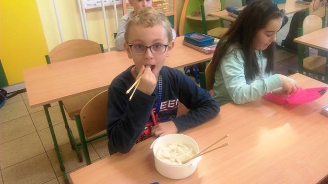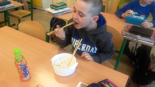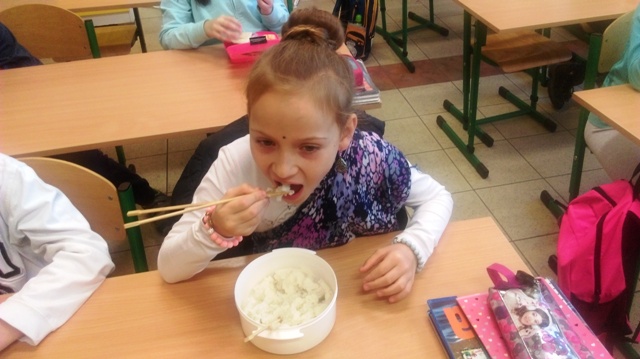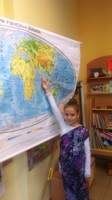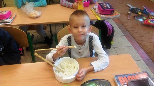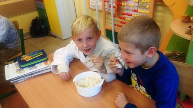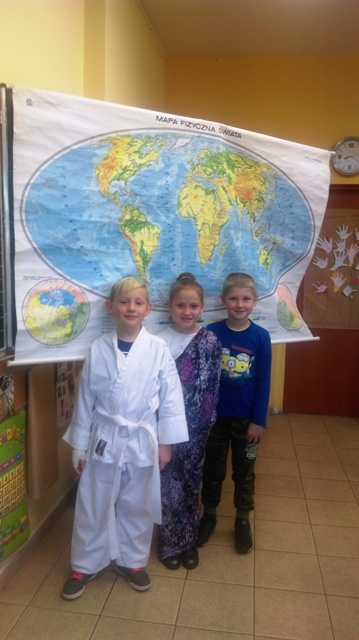 Chłopiec o imieniu Yao - co znaczy „jasny” , opowiedział o Chinach i pokazał pałeczki do jedzenia ryżu. Każdy mógł spróbować i ryż i posługiwanie się tymi nietypowymi sztućcami. Dziewczynka o imieniu Pari – to imię oznacza „duszek”, opowiedziała o Indiach, a chłopiec w stroju karateki, który opowiedział o Japonii, to Haruki – „świecące słońce”.