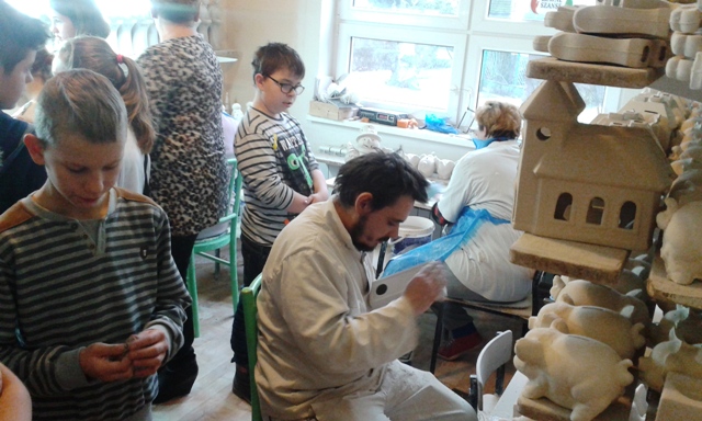 Wszyscy uczestnicy wycieczki podpatrywali produkcję ceramiki użytkowej i dekoracyjnej. Dowiedzieli się jak powstają gipsowe figurki- od procesu zalewania formy do wygładzania elementów i suszenia w wielkim piecu. Następnie uczniowie samodzielnie ozdabiali swoje eksponaty- mikołajkowe buty, techniką decoupage. Efektem samodzielnej pracy dzieci były przepiękne prace, które z radością zabrali do domu. Na koniec każdy uczestnik otrzymał miły upominek, ciekawą ramkę do zdjęć.
