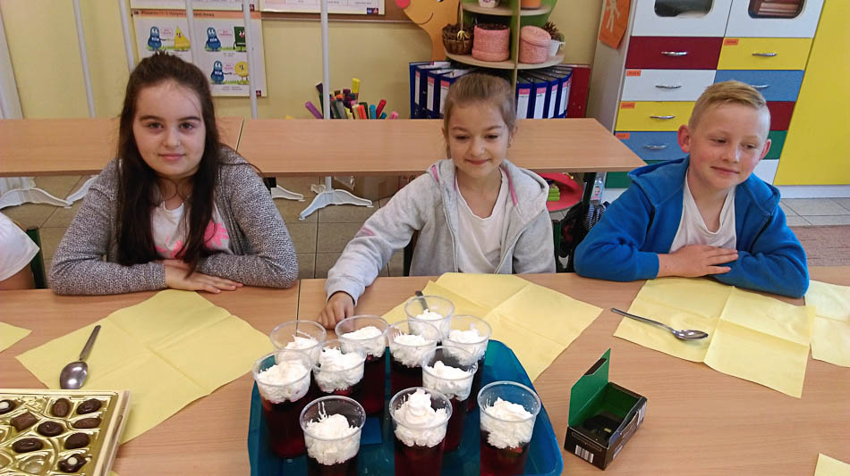 Widok uśmiechniętych twarzy trzeciaków - bezcenny. W ten sposób lekcje rozpoczęliśmy od ucztowania. Deser, miętowe czekoladki i bombonierka bardzo wszystkim smakowały. Sprawczynią tej słodkiej niespodzianki, okazała się mama Piotrusia – pani Katarzyna Malinowska. Jeszcze raz dziękujemy