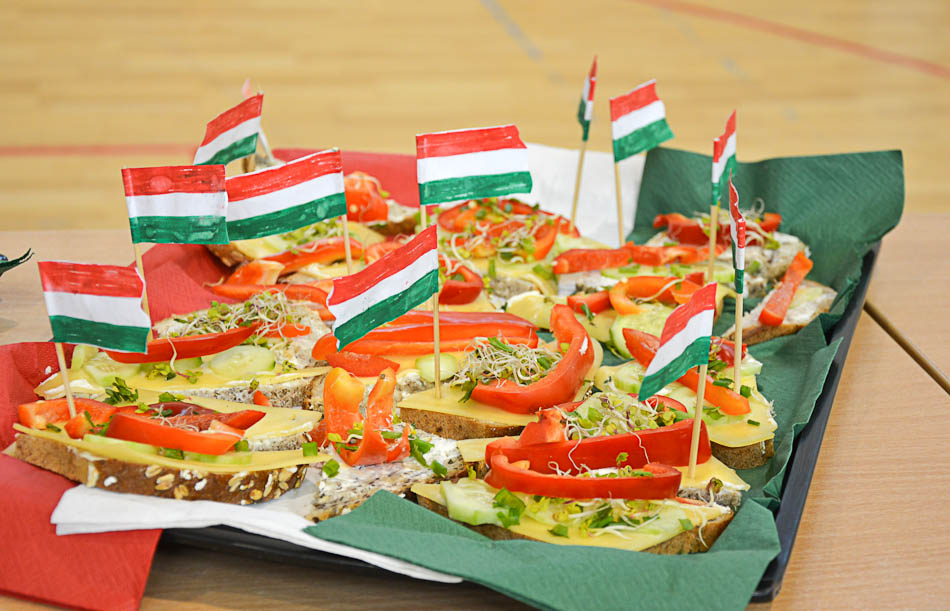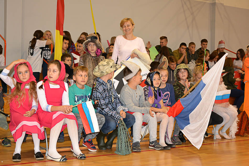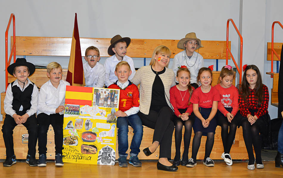 Z tej okazji nauczyciele języka niemieckiego i angielskiego przygotowali dla naszych uczniów mnóstwo atrakcji. Zadaniem każdej klasy było przygotowanie flagi, plakatu, potrawy oraz przebrania za odpowiednie postaci wylosowanego kraju. W klasach młodszych były to postaci z bajek, a w klasach starszych znane osobistości oraz postaci historyczne. Reprezentanci klas wzięli również udział w quizie i w konkursie muzycznym, w którym to zdobywali punkty za właściwe rozpoznanie języka słyszanej piosenki. Tego dnia mogliśmy usłyszeć na żywo piosenki niemieckie, chorwackie i czeskie w wykonaniu naszych utalentowanych wokalnie uczennic, obejrzeć ciekawe prezentacje o krajach europejskich, filmiki, wierszyki i scenki o korzyściach wynikających ze znajomości języków obcych. Po pląsach uczniów w barwnym korowodzie europejskim, nastąpił moment długo wyczekiwany przez wszystkich - europejskie śniadanie, przygotowane przez uczniów każdej klasy.