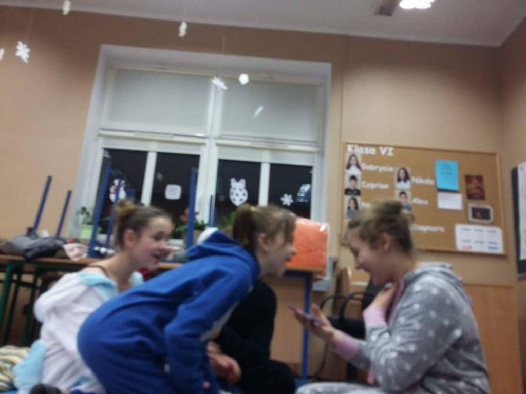 W piątek wieczorem 1 grudnia 2017r. wspólnie z naszą wychowawczynią p.Anną Husak zorganizowaliśmy w szkole zabawę andrzejkową. Dowiedzieliśmy się, że święto to obchodziły głównie panienki, które z wróżb odczytywały informacje o swoich przyszłych planach małżeńskich. Potem odbyły się typowe dla Andrzejek wróżby i konkursy np. ciasteczka z wróżbą, ustawianie butów, wróżenie z jabłkowych skórek, przekłuwanie szpilką serduszek z imieniem….W ustalonych wcześniej grupach szykowaliśmy ulubione przekąski i kolację: owocowe koktajle, lody truskawkowe i oczywiście pizzę. Wyczekiwaliśmy chwili, kiedy pani poda komendę ”piżama party”. W jednej chwili zamieniliśmy swoje codzienne ubrania na jednoczęściowe piżamy kotów, króliczków, misiów i słoni. Było wesoło i zabawnie, kiedy przystąpiliśmy do wojny na poduchy, nocnych podchodów i innych sportowych wyczynów.Najistotniejsze jednak dla nas było nocowanie, a raczej rozmowy, śmiechy i nieformalne zakłady – kto dłużej nie zaśnie…