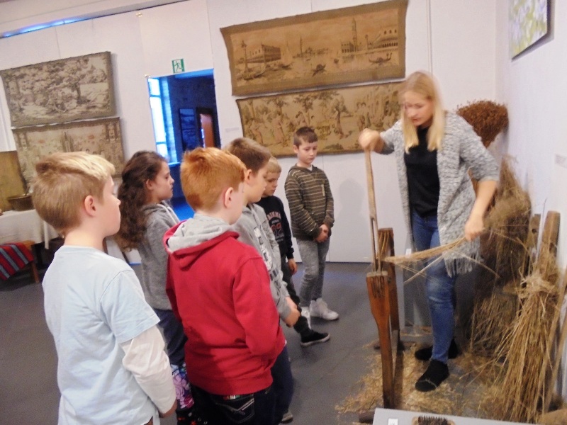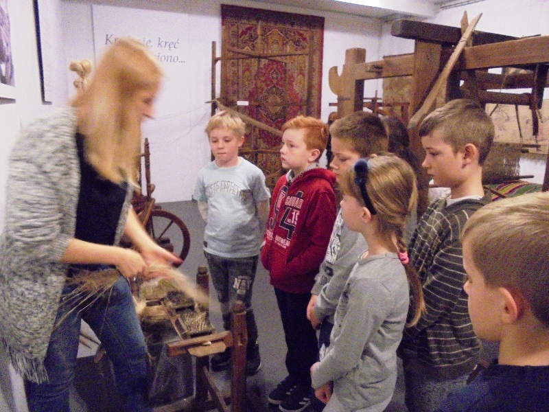 24 października uczniowie klasy III zwiedzili w Muzeum Ziemi Nadnoteckiej w Trzciance, wystawę "Kręć się, kręć wrzeciono..." oraz uczestniczyli w warsztatach tkackich "Od nasionka do tkaniny". Dzieci poznały proces powstawania tkaniny. Widziały pracę międlicy, mogły dotknąć paździerzy, obejrzały kołowrotek i wrzeciono, dowiedziały się co to jest osnowa i jak nie zgubić wątku. Obserwowały pracę przy krośnie i oglądały lnianą odzież. A później samodzielnie utkały zakładki do książek. Okazało się, że Filip, posiada zdolności tkackie - najszybciej utkał swoją zakładkę i ani razu się nie pomylił. Do szkoły wróciliśmy bardzo zadowoleni i chętnie wybierzemy się na kolejne warsztaty.