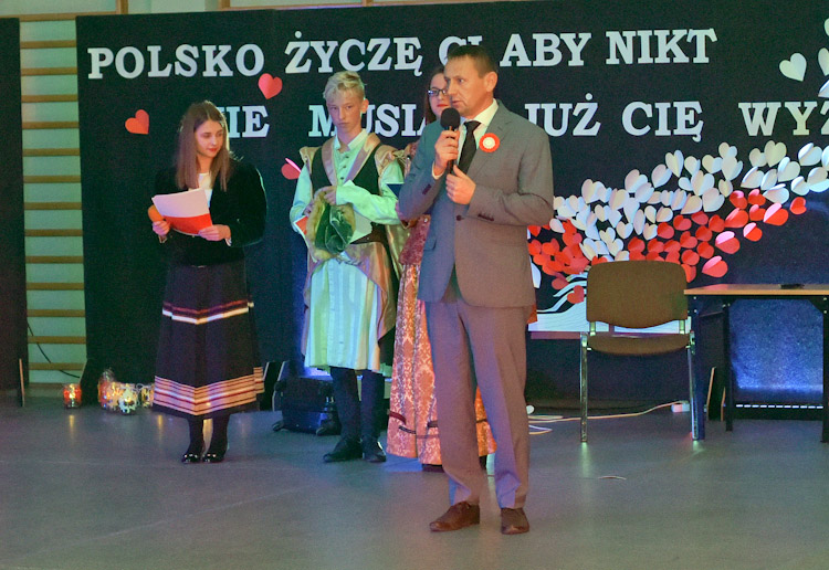 Przybyli goście byli świadkami odkrywania kart historii naszego narodu, przeplatanych deklamacją wierszy oraz pięknym i wzruszającym śpiewem naszych uczennic, grą na instrumencie i występami zespołu wokalnego. Uczniowie pokazali nam również scenkę z życia codziennego, ukazującą osobiste tragedie i rozterki wielu Polaków, opuszczających nasz kraj w poszukiwaniu lepszego życia. Jednym z elementów wydarzenia był również polonez, brawurowo wykonany przez naszych uczniów z klasy 8 oraz klas III gimnazjum. Warto dodać, że uczniowie zatańczyli w przepięknych strojach, co zrobiło na widzach ogromne wrażenie.