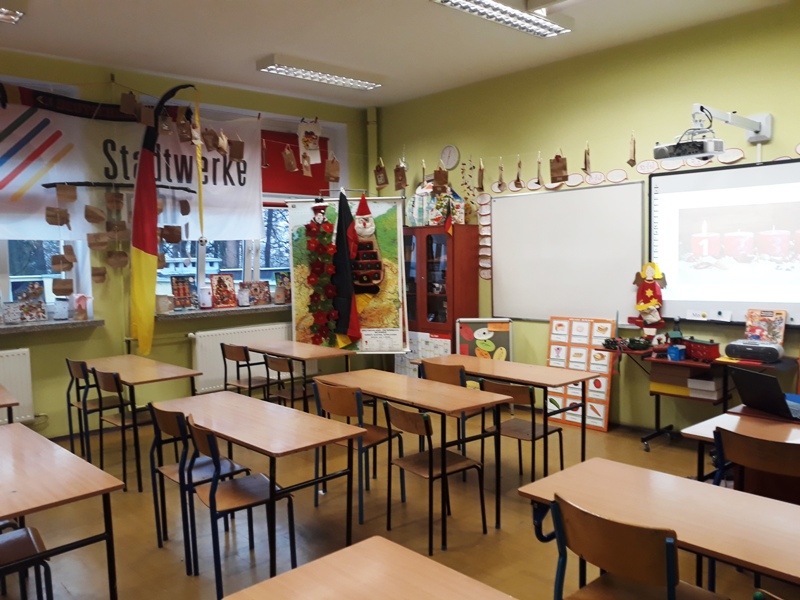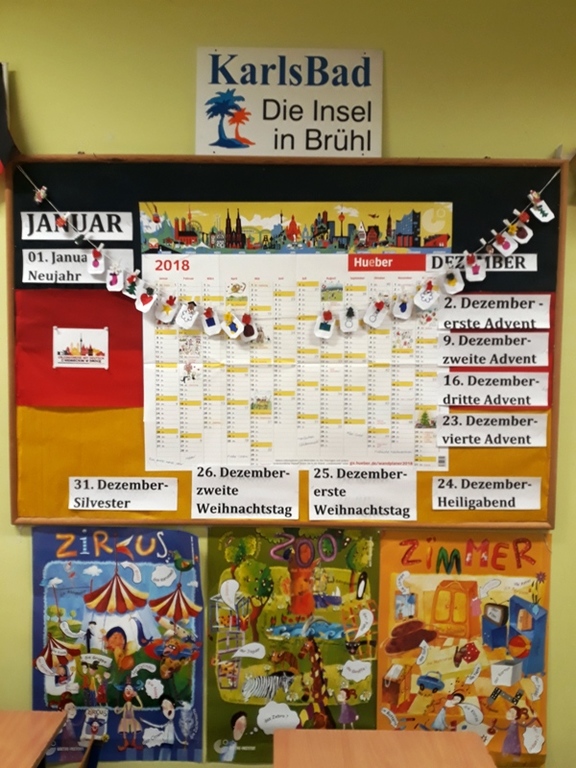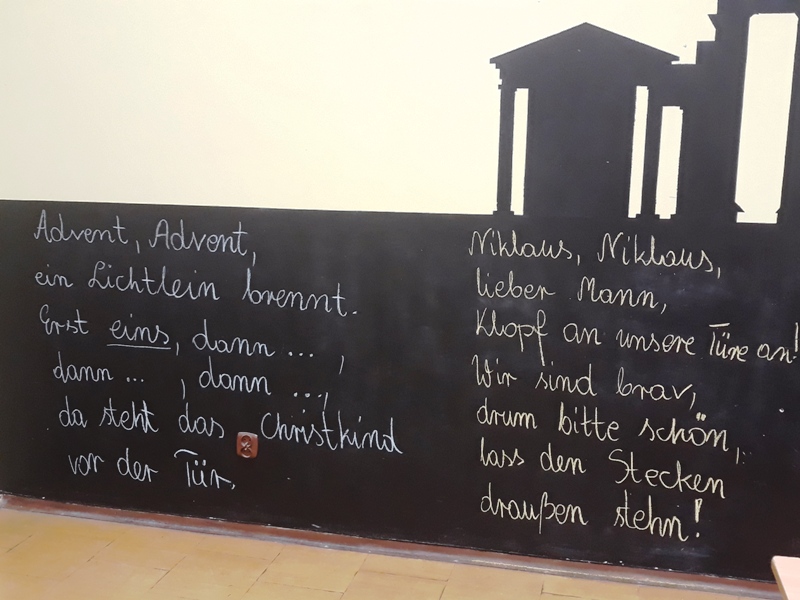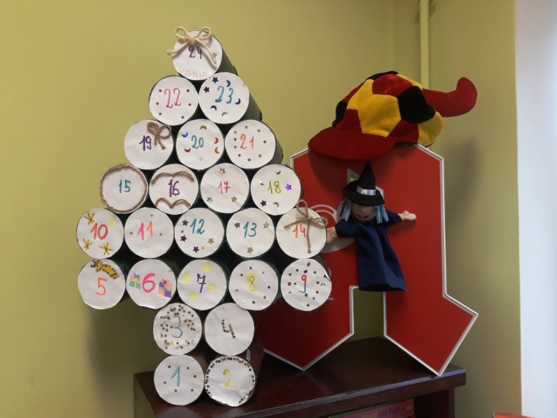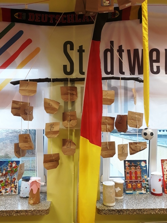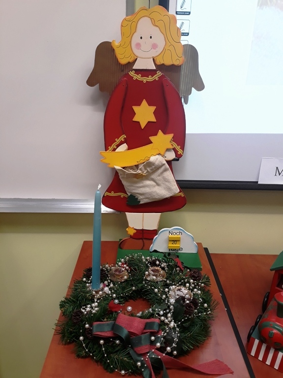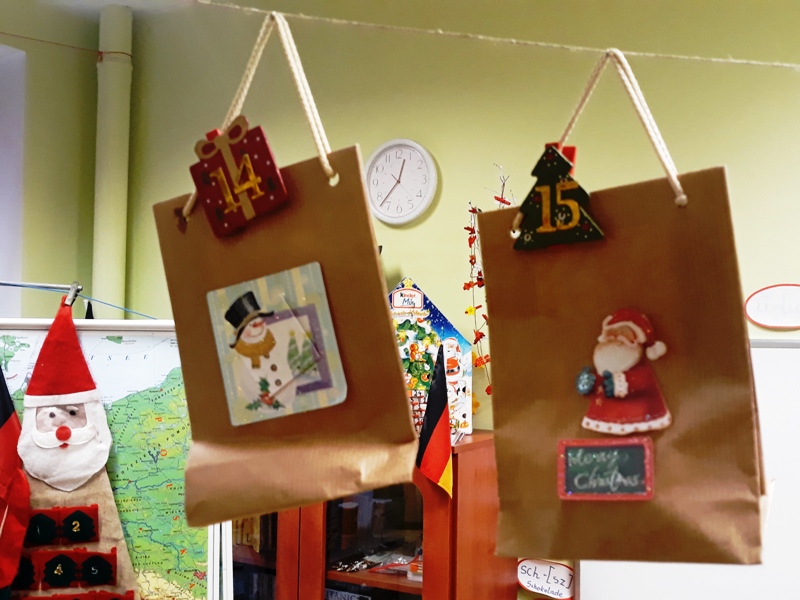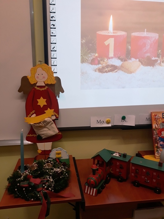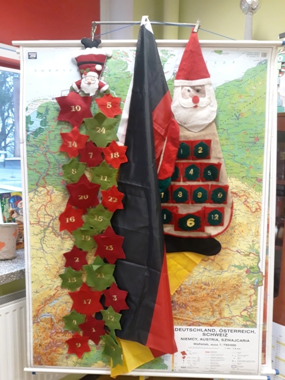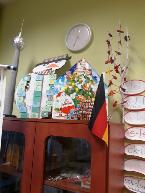 Tak oto już drugi tydzień trwa charakterystyczny dla niemieckiego obszaru językowego okres poprzedzający Boże Narodzenie, zwany również w Polsce Adwentem. Uczniowie Szkoły Podstawowej w Siedlisku, którzy uczą się języka niemieckiego jako głównego, mają okazję w sposób namacalny obcować ze zwyczajami i tradycjami panującymi w tym okresie w krajach DACH. Jednym z nich jest „Adventskranz”- wieniec adwentowy, który w klasopracowni języka niemieckiego wyznacza czas kolejnych niedziel adwentu. Warto dodać, że jest obok kalendarza adwentowego, jeden z głównych symboli tego czasu w kulturze niemieckiej. Kolejnym jest wspomniany wcześniej „Adventskalender”, który charakteryzuje się 24 okienka, które otwierane kolejno od 1 grudnia pomagają dzieciom odliczać czas pozostały do Bożego Narodzenia. Te i wiele innych symboli uczniowie poznają w okresie adwentu podczas kulturoznawczych zajęć na lekcjach języka niemieckiego.
