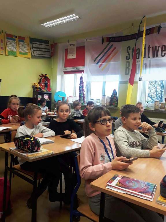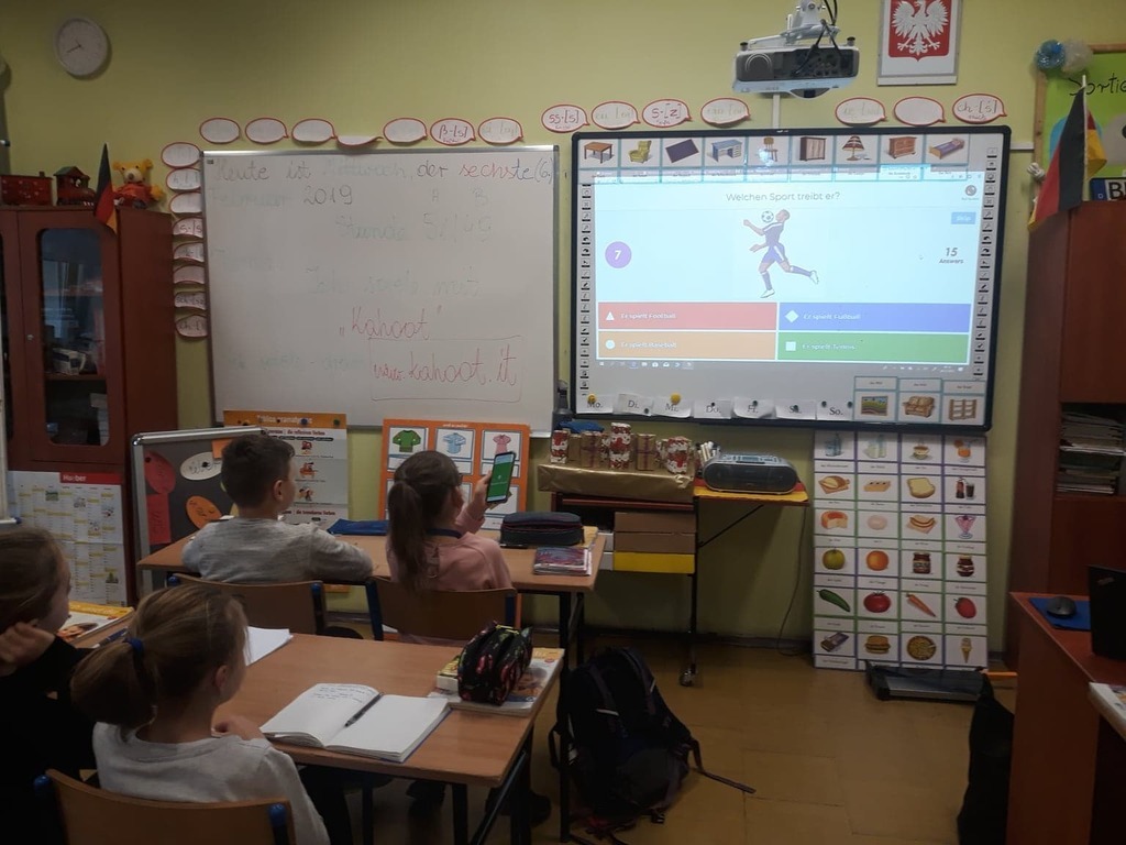Podczas minionego tygodnia IT podczas zajęć języka niemieckiego uczniowie w ramach ćwiczeń korzystali ze smartfonów lub tabletów, by w ciekawy i czasem też zabawny sposób, utrwalić wiedzę z poszczególnych tematów, które akurat były omawiane na lekcjach i nie tylko. W zabawie uczestniczyli wszyscy uczniowie od klas IV począwszy, na klasach III gimnazjum skończywszy. Nauka była prowadzona z użyciem platformy „kahoot”, która jest bezpłatną platformą do tworzenia i przeprowadzania interaktywnych quizów, oferującą szeroki zakres tematyczny nie tylko z języka niemieckiego, ale wielu innych języków i przedmiotów. Uczniowie doskonale się przy tym bawili, pracując zarówno indywidualnie, jak i w grupach, ćwicząc i utrwalając określone słownictwo lub zagadnienia gramatyczne. Jesteśmy zgodni, że taką formę nauki będziemy częściej wykorzystywać na lekcjach języka niemieckiego, tak , żeby wszyscy uczniowie jednocześnie mogli odpowiadać na pytania, a nie tak jak do tej pory pojedynczo podczas ćwiczeń z tablicą multimedialną lub multibookiem.