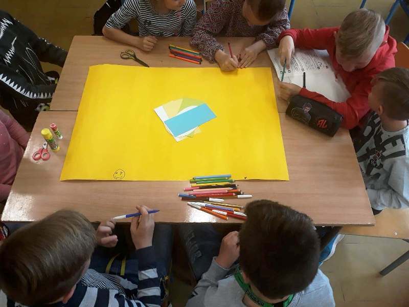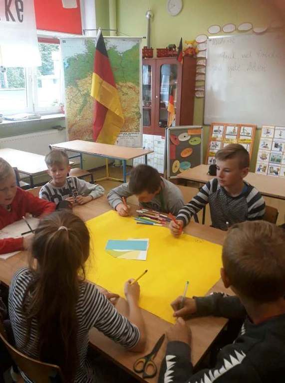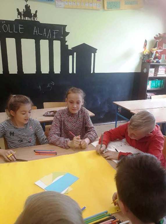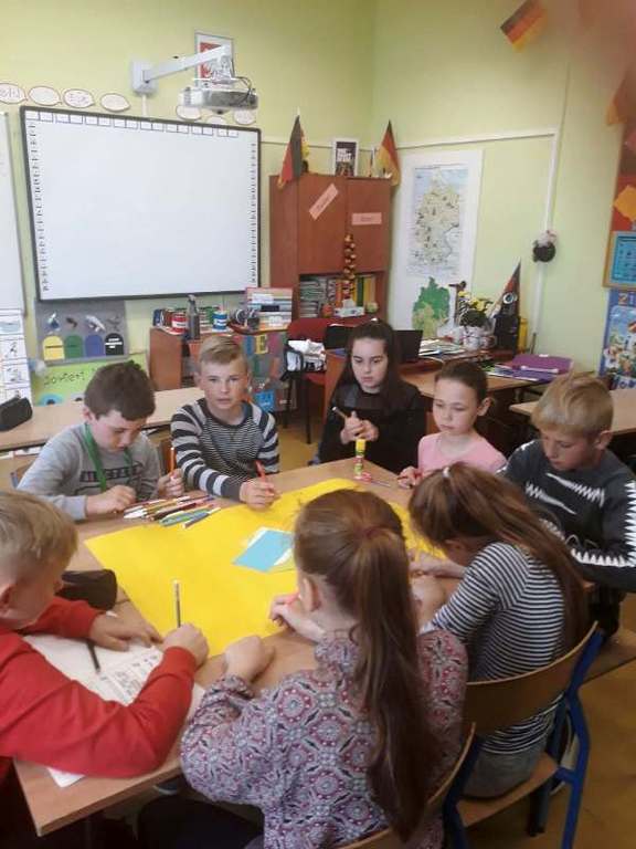 Uczniowie klasy V a w niecodzienny sposób postanowili wykonać jedno z zadań, które obowiązywało ich podczas omawiania tematu urodzin. Postanowili wspólnie przygotować jedną dużą kartkę z życzeniami dla swojej wychowawczyni i wypisać ją i ozdobić. Oczywiście treść życzeń była w języku niemieckim.
