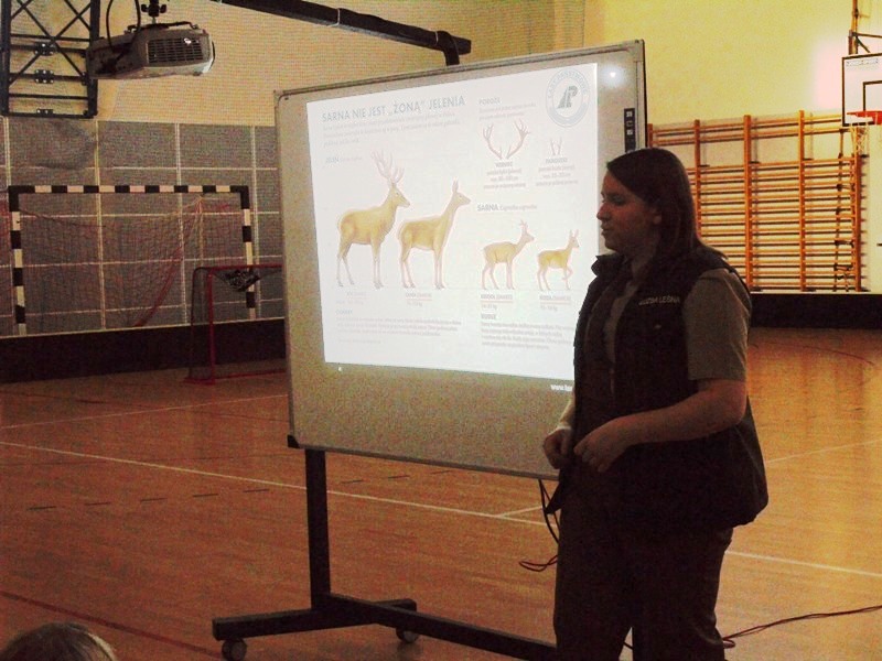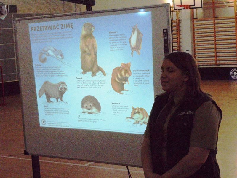 Mimo, że zima nie jest mroźna, ani śnieżna, bardzo chcemy pomóc ptakom przetrwać trudny dla nich czas. Dlatego zaprosiliśmy do szkoły panią Martę Drzewiecką - leśnika z Nadleśnictwa Trzcianka. Pani Marta opowiedziała nam o ptakach, które możemy zobaczyć zimą w naszych ogrodach i lasach. Dowiedzieliśmy się w jaki sposób dokarmiać poszczególne gatunki, gdzie wieszać karmniki. Nasz gość opowiedział nam również o zwierzętach występujących w polskich lasach. Wiemy już, że sarna nie jest "żoną" jelenia, małego dzika nazywamy warchlakiem albo pasiakiem, a zimowe legowisko niedźwiedzia to gawra.