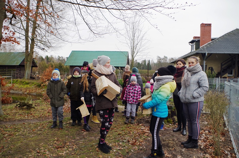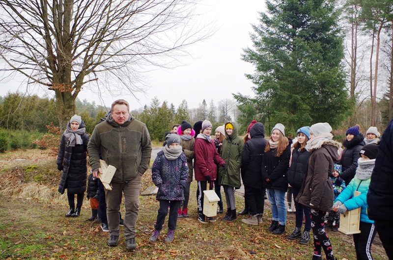 W sobotę 29 lutego, mimo niesprzyjającej pogody, wybraliśmy się do Szkółki Gospodarczej w Niekursku, aby powiesić skrzynki lęgowe dla ptaków, które wykonaliśmy z pomocą naszych rodziców. Wspólnie z leśnikami: panem Emilem Lehwarkiem i panią Martą Drzewiecką oraz myśliwymi: prezesem Kołą Łowieckiego "Dzik" panem Jarosławem Czemko i łowczym panem Tomaszem Frąckowiakiem, powiesiliśmy 11 budek. Były to budki różnego typu: dla sikorek, mazurków, szpaków i puszczyków. Nasze spotkanie zakończyło się pieczeniem kiełbasek przy ognisku i słodkim poczęstunkiem. Otrzymaliśmy również upominki od pani Marty Drzewieckiej. Mamy nadzieję, że te "mieszkania do wynajęcia" spodobają się ptakom i szybką zostaną zasiedlone.