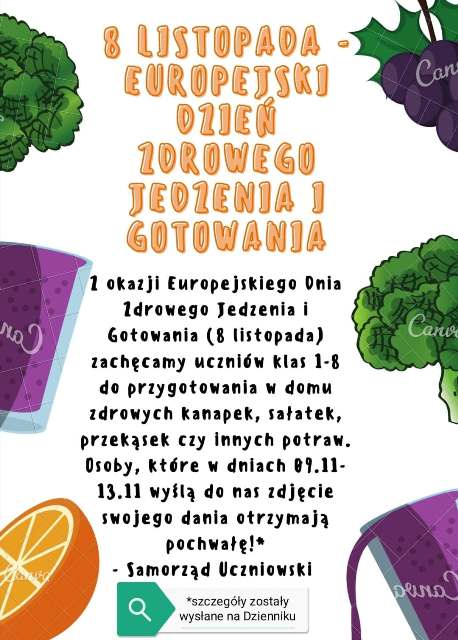 Z okazji Europejskiego Dnia Zdrowego Jedzenia i Gotowania, który odbył się 8 listopada, organizujemy jako samorząd szkolny zdalną akcję. W dniach 09.11 (poniedziałek) – 13.11 (piątek) uczniowie mogą przygotować w domu zdrową kanapkę, sałatkę, przekąskę, a nawet cały posiłek. Starsi uczniowie mogą wykonać taką potrawę samodzielnie, a młodsi z pomocą rodziców. Głównym celem akcji jest zachęcenie uczniów do przygotowywania i spożywania zdrowych posiłków, które są niezwykle ważne dla naszego zdrowia, samopoczucia oraz odporności. Uczniowie z klas 1-8, którzy wyślą zdjęcia przygotowanych przez siebie zdrowych dań otrzymają pochwałę.