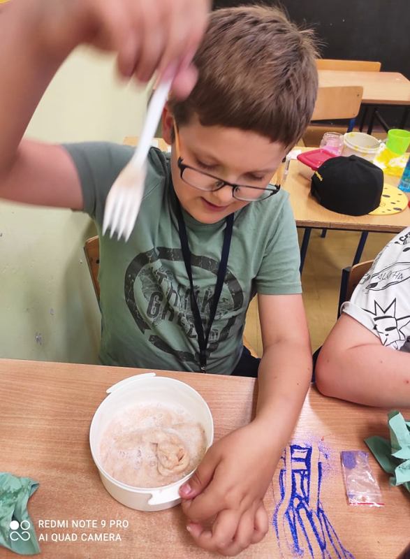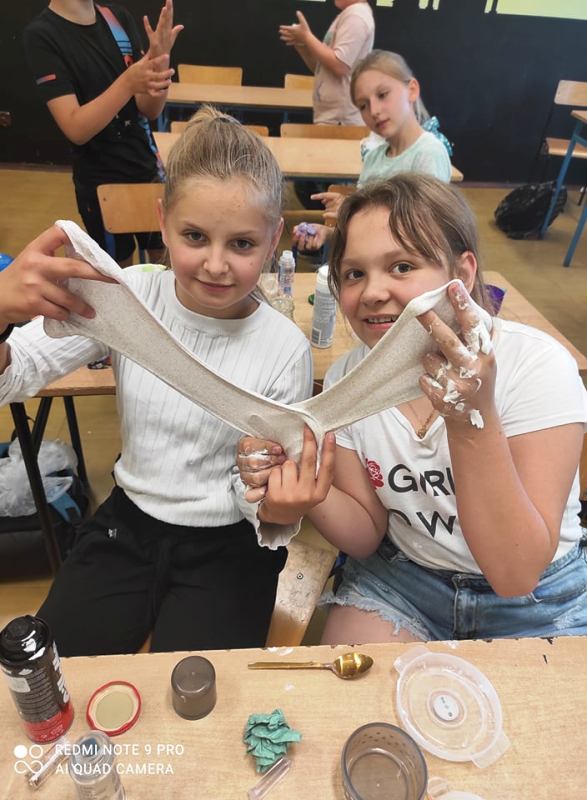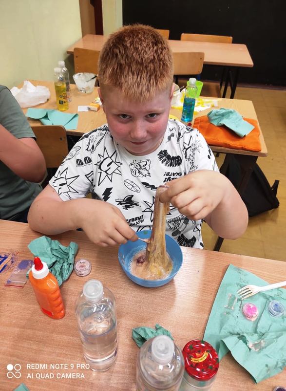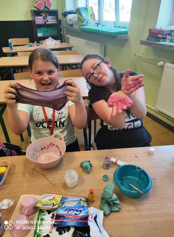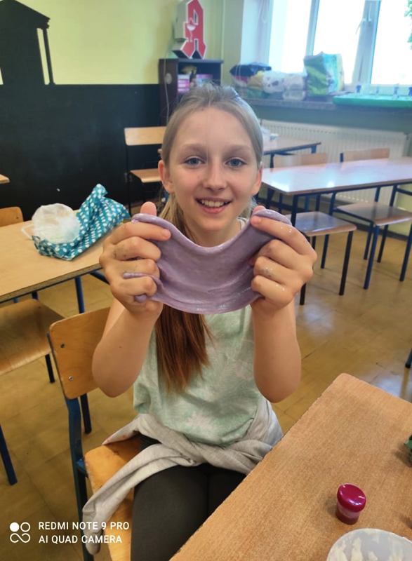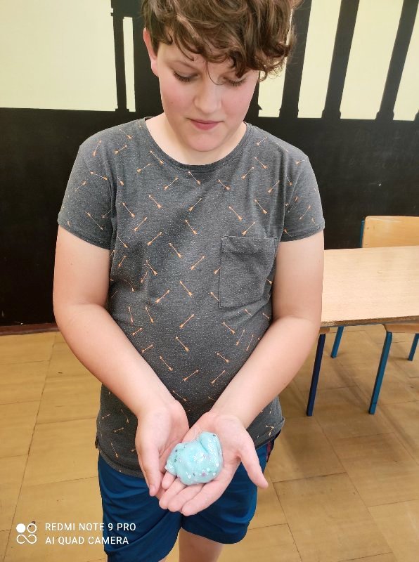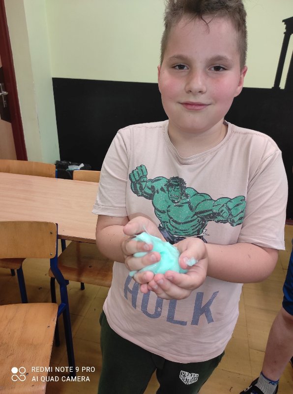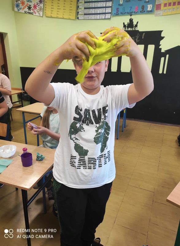 Uczniowie klasy 4 z radością i entuzjazmem tworzą tzw. slime. Angielski rzeczownik „slime” oznacza szlam, śluz lub muł. Po polsku zabawka zwana slime jest najczęściej nazywana glutem lub glutkiem, co ma związek z rozciągliwością materiału, z którego powstaje. Niewiele pracy, a radość przeogromna!