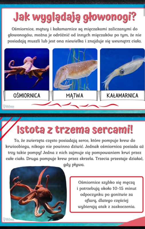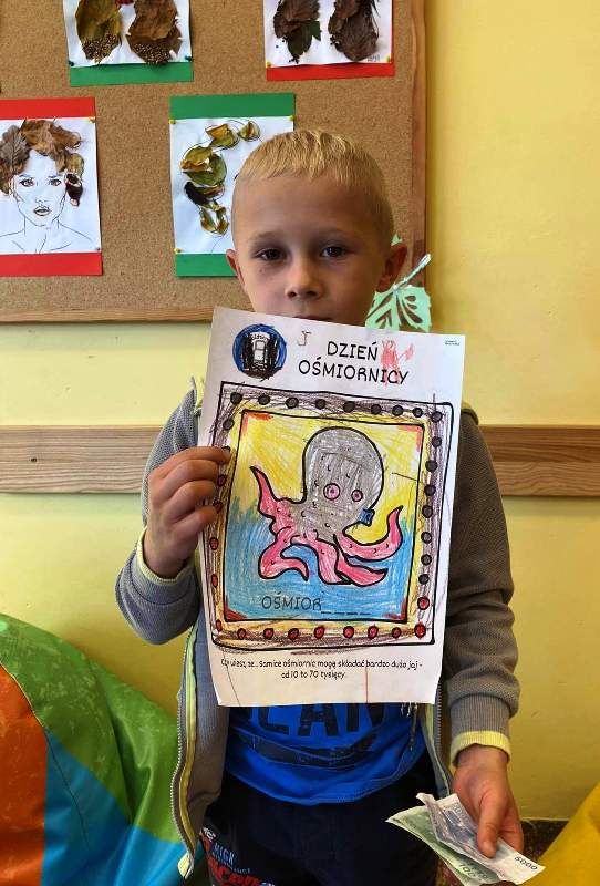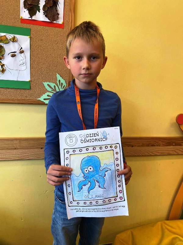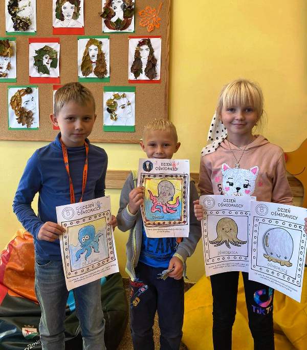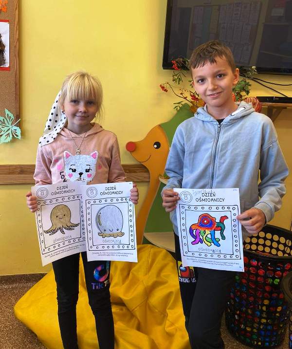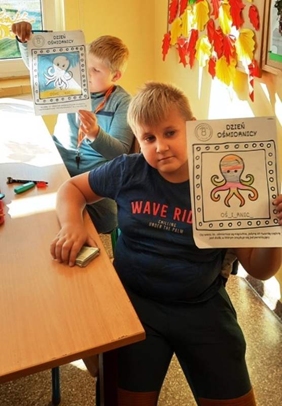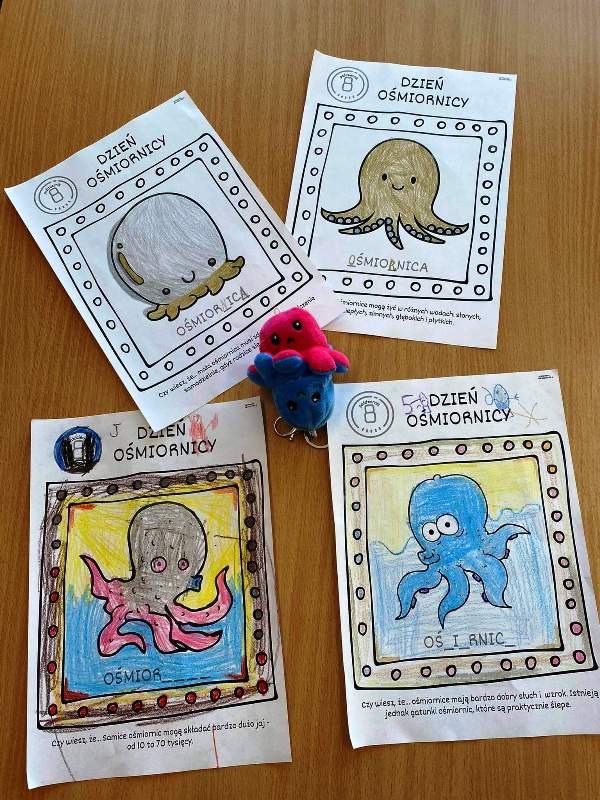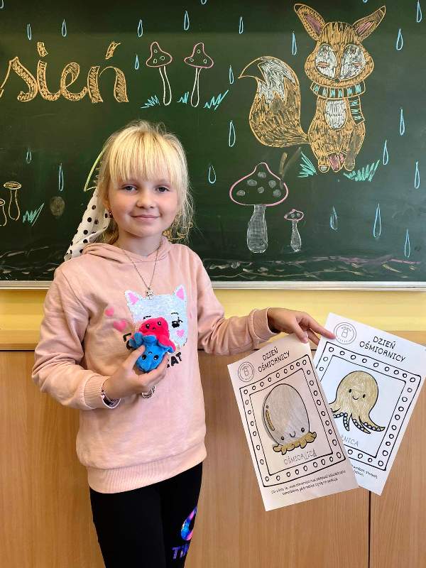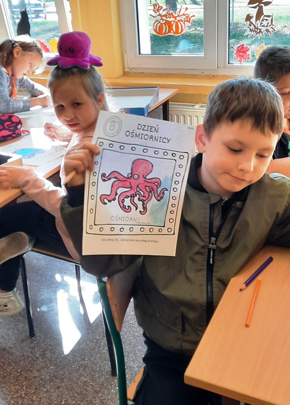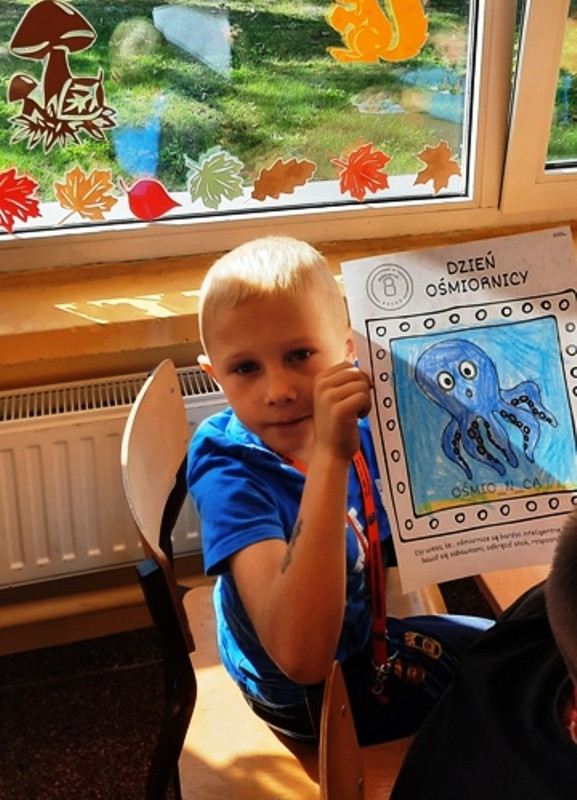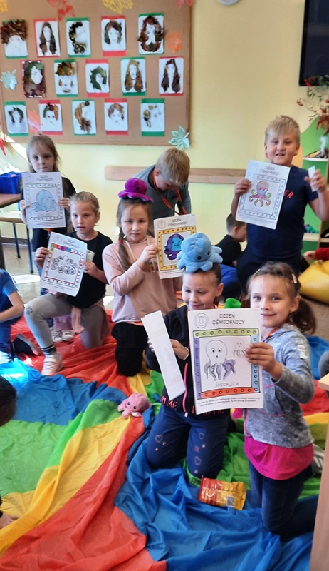 Dziś nasze siedliskowe „Świetliczaki” obchodziły „Światowy Dzień Ośmiornicy”, który corocznie odbywa się 8 października. Data tego wydarzenia nie jest przypadkowa. 8 października oznacza bowiem osiem ramion ośmiornicy, natomiast kałamarnice i mątwy posiadają 8 ramion i 2 macki-stąd miesiąc październik. Tego dnia dzieci uczęszczające do świetlicy szkolnej dowiedziały się jaki jest cel tego wydarzenia, jak wyglądają głowonogi, czym się żywią i jak są zbudowane. Wiele radości sprawiły dzieciom kolorowanki z różnymi gatunkami ośmiornic oraz maskotki ośmiorniczki, które towarzyszyły im przez cały dzień.