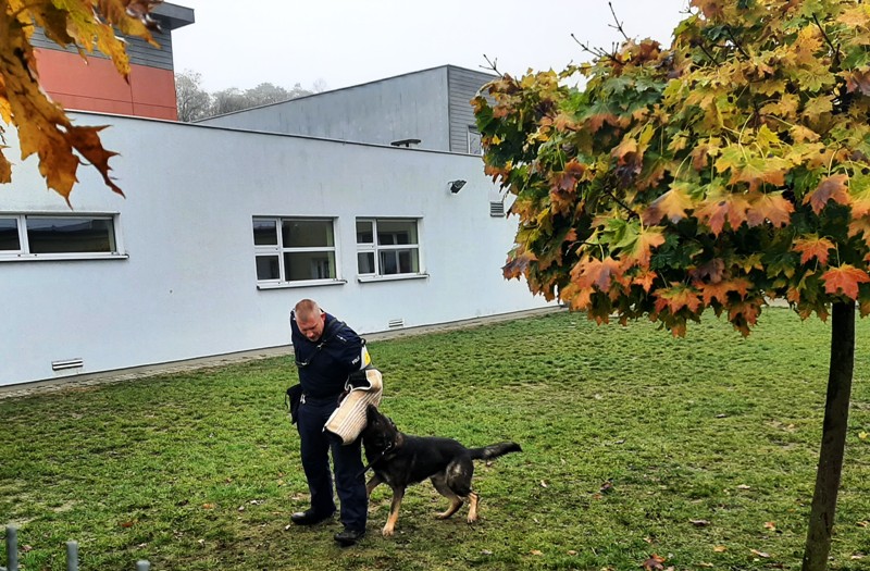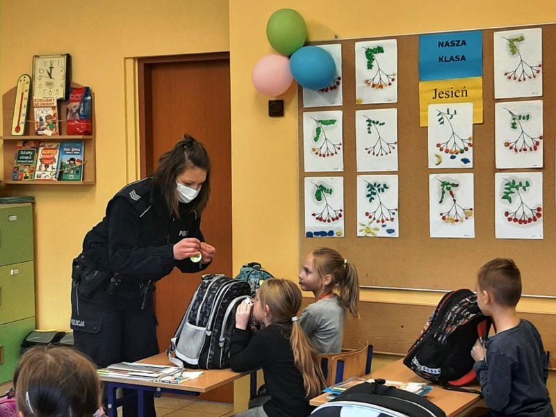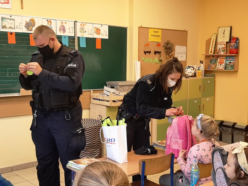 03.11.2021r. naszą szkołę odwiedzili: pani sierżant sztabowa Agata Derezińska, pan młodszy aspirant Michał Woźnicki oraz Portos – pies policyjny. Uczniowie mogli zobaczyć elementy treningu psa i jego umiejętności. Następnie pierwszoklasiści wzięli udział w pogadance na temat bezpieczeństwa i otrzymali elementy odblaskowe, które przyczepili do swoich plecaków, by być widocznym na drodze.