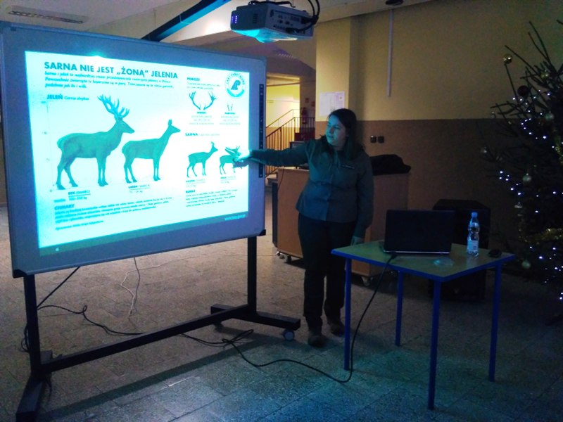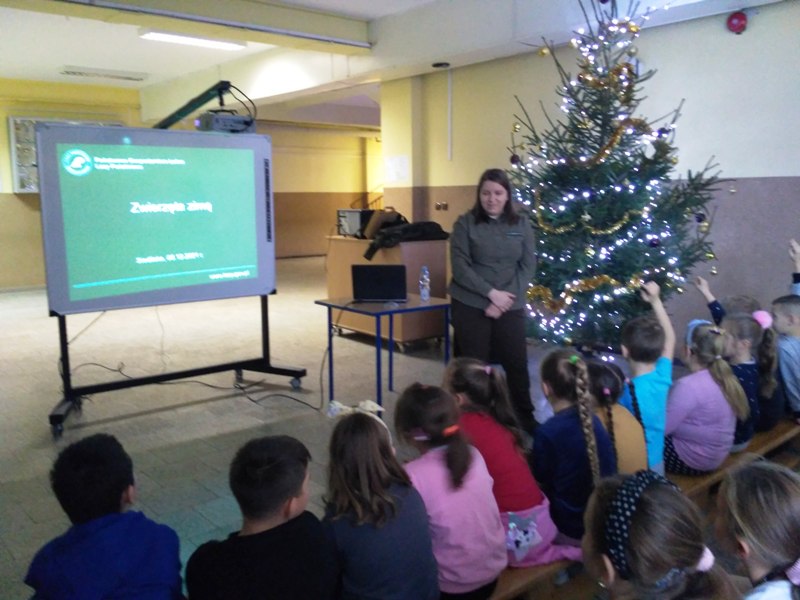 8 grudnia odwiedziła nas pani Marta Drzewiecka - leśnik z Nadleśnictwa Trzcianka. Nasz gość przygotował prezentację dla uczniów klas I-III na temat zwierząt i ptaków podczas zimy. Dzieci dowiedziały się, które leśne zwierzęta zasypiają na zimę, a które potrzebują naszej pomocy, które ptaki odleciały jesienią do cieplejszych krajów, a które pozostały. Pani opowiedziała nam, w jaki sposób możemy pomóc ptakom i zwierzętom przetrwać trudny dla nich, zimowy czas.