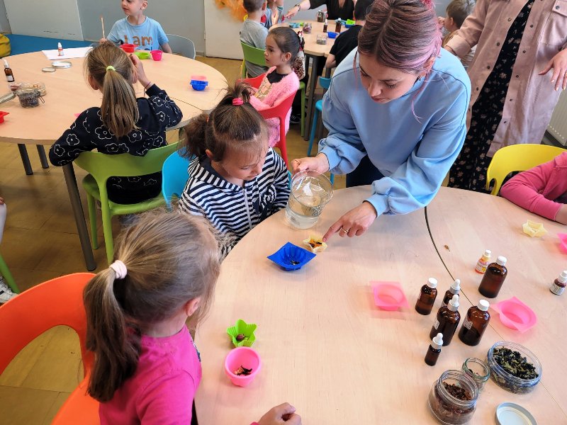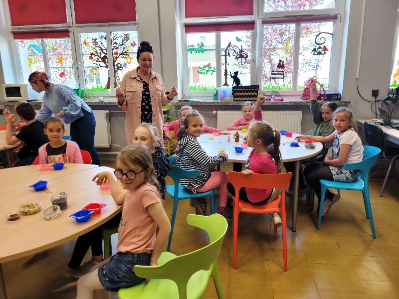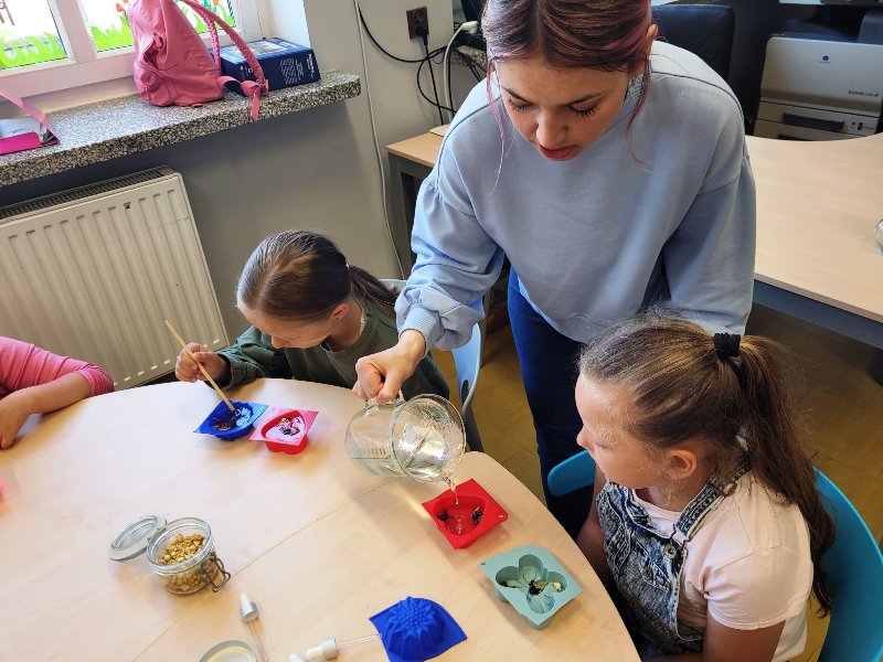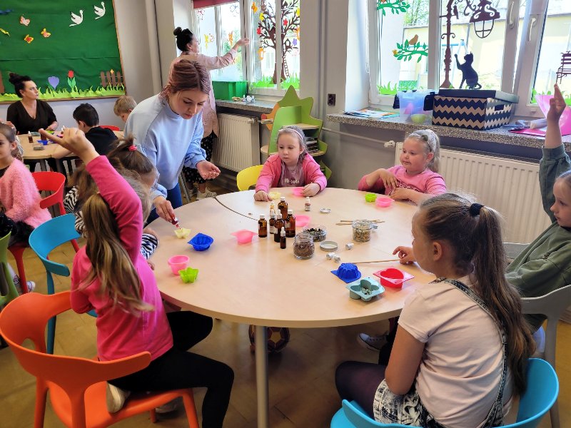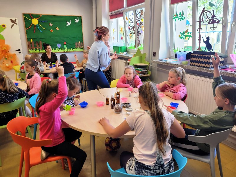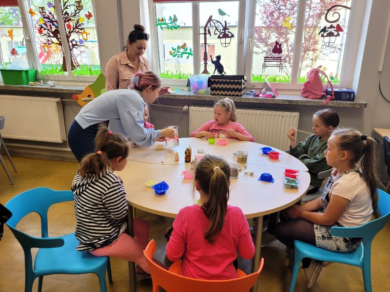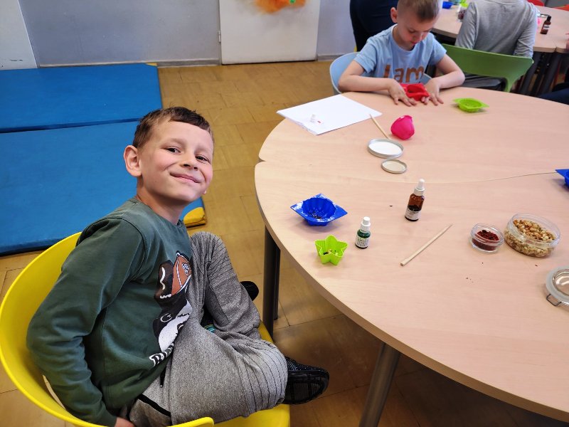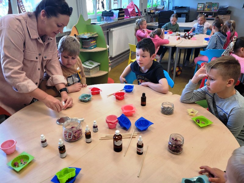 Uczniowie klas I-III uczestniczyli w zajęciach mydlarskich. Kolorowe, pachnące mydełka własnej produkcji były doskonałym upominkiem z okazji Dnia Matki.