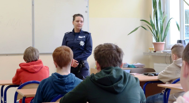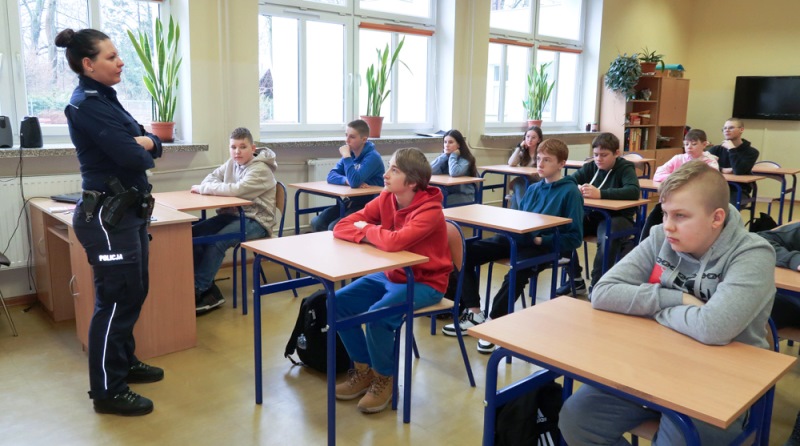 Naszą szkołę odwiedziła pani policjant Agata Derezińska, która przeprowadziła pogadankę z uczniami klas 5-8 na temat odpowiedzialności nieletnich oraz niewłaściwego korzystania z internetu i zagrożeń z tym związanych.