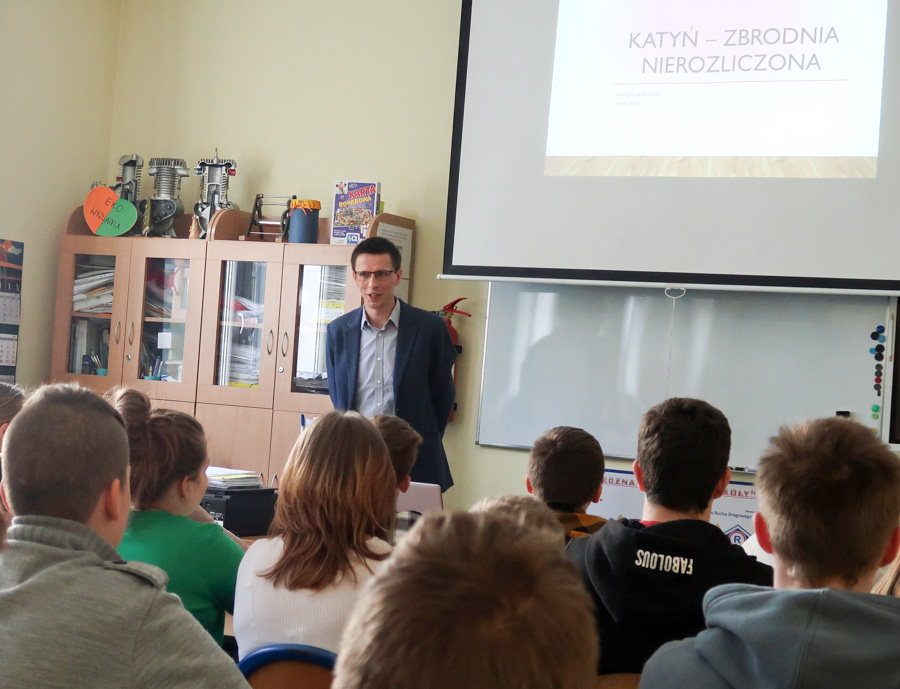 27 kwietnia 2023 r. w naszej szkole, dr Piotr Grzelak przeprowadził wykład na temat: "Katyń - zbrodnia nierozliczona". W trakcie prelekcji uczniowie poznali nie tylko historię Katynia, ale także usłyszeli ciekawą opowieść o płótnie katyńskiego krzyża z Siedliska. Przygotował je mieszkaniec wsi Rychlik Stanisław Przybył i wraz z towarzyszami, członkami antykomunistycznego podziemia, w 1988 r. umieścił na cmentarzu w Siedlisku. Za swój czyn był ścigany przez organy komunistycznej Polski. Poszukiwania były intensywne ale nieskuteczne. Nie udało się pojmać działaczy Solidarności, którzy upamiętnili ofiary zbrodni katyńskiej oraz ofiary reżimu komunistycznego. Płótno znajduje się obecnie w zbiorach IPN.