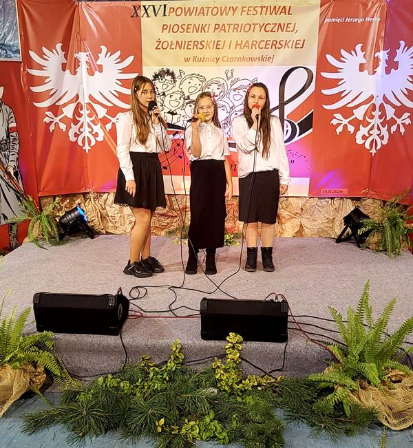 14.11.2024r. uczennice naszej szkoły: Antonina Buśka, Oliwia Dopieralska i Amelia Kilian wzięły udział w XXVI Powiatowym Konkursie Piosenki Patriotycznej w Kuźnicy Czarnkowskiej. Pięknie zaśpiewały piosenkę "Dziś do Ciebie przyjść nie mogę" i zdobyły II miejsce.