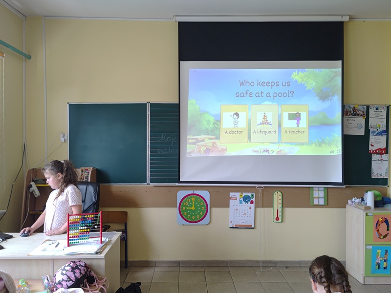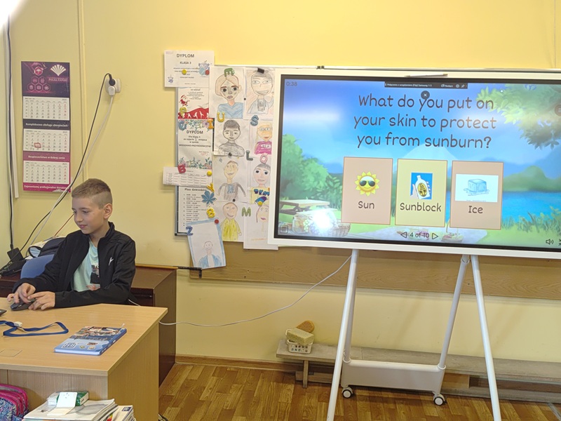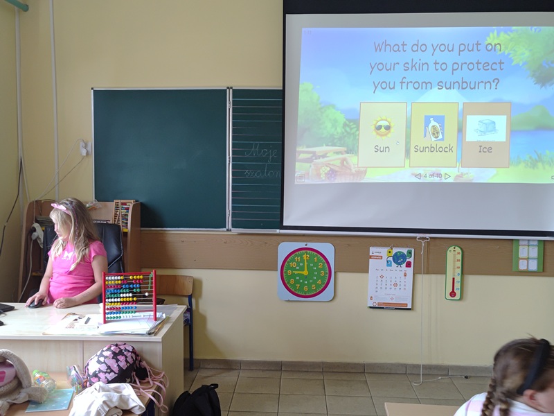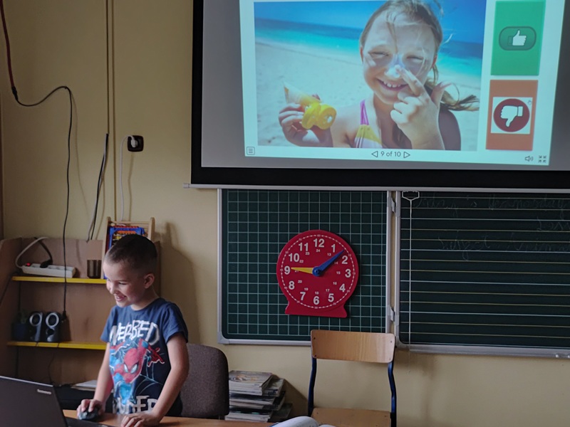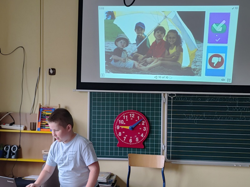 Na lekcjach języka angielskiego uczniowie grali w interaktywne gry dotyczące wakacji oraz bezpiecznego zachowania latem. Te gry były ciekawym sposobem na przećwiczenie słownictwa i odpowiadania na pytania w języku angielskim.