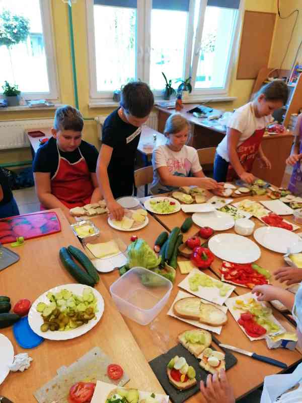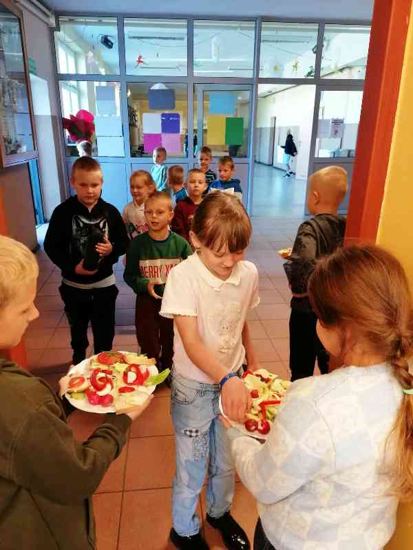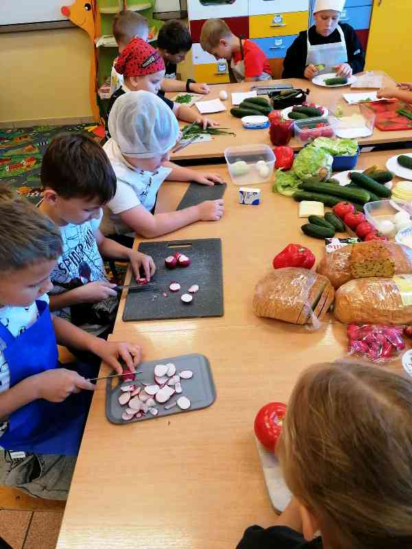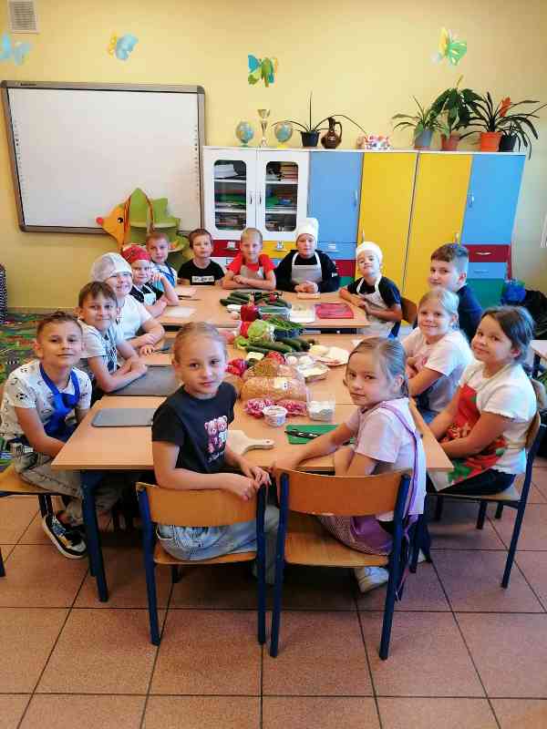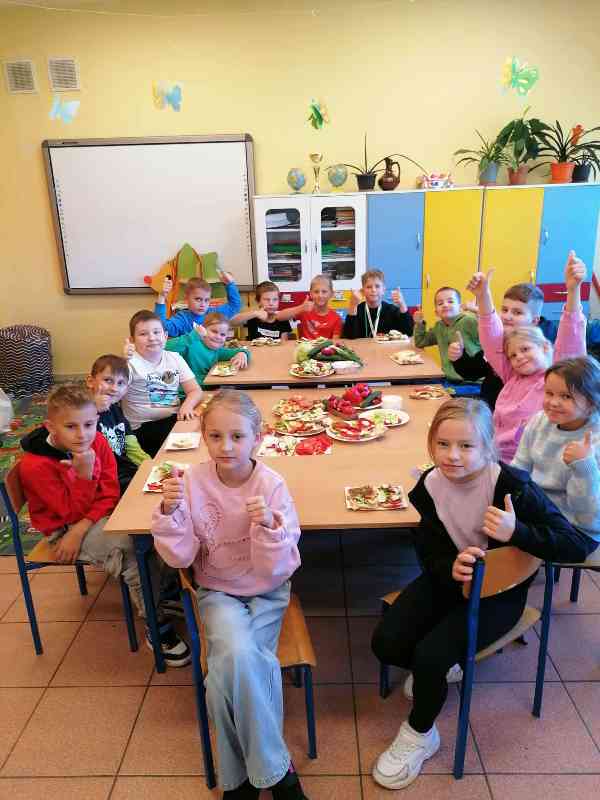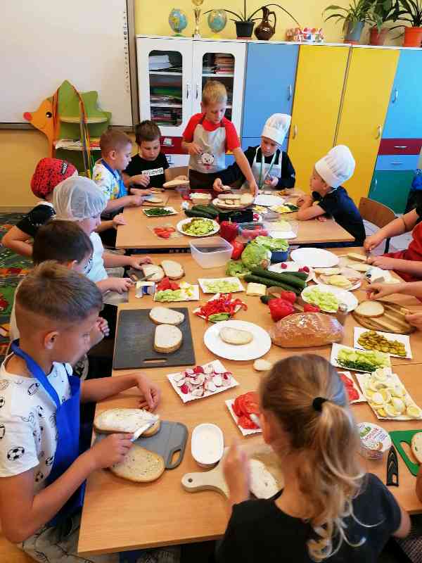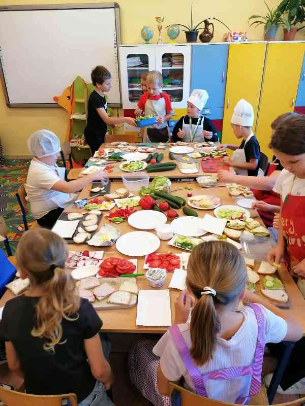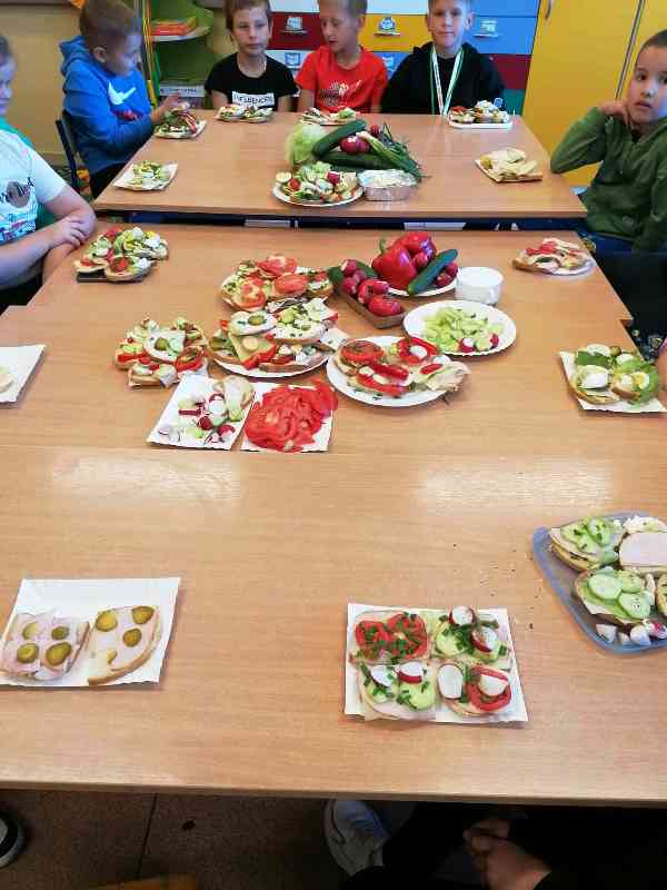 W czwartek 25 września uczniowie klasy trzeciej zorganizowali zdrowy posiłek w swojej klasie. Dzieci przyniosły potrzebne produkty. Na stole królowały warzywa takie jak pomidory, ogórki, rzodkiewka, papryka, sałata, szczypior itp. Wszyscy samodzielnie obierali oraz kroili warzywa, smarowali pieczywo a następnie przygotowali barwne kanapki. Po pracy dzieci pięknie udekorowały stół i z apetytem zjadły zdrowe śniadanie. Poczęstowano również kolegów i koleżanki z młodszych klas.
