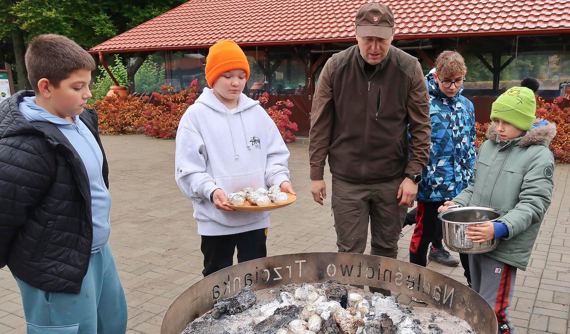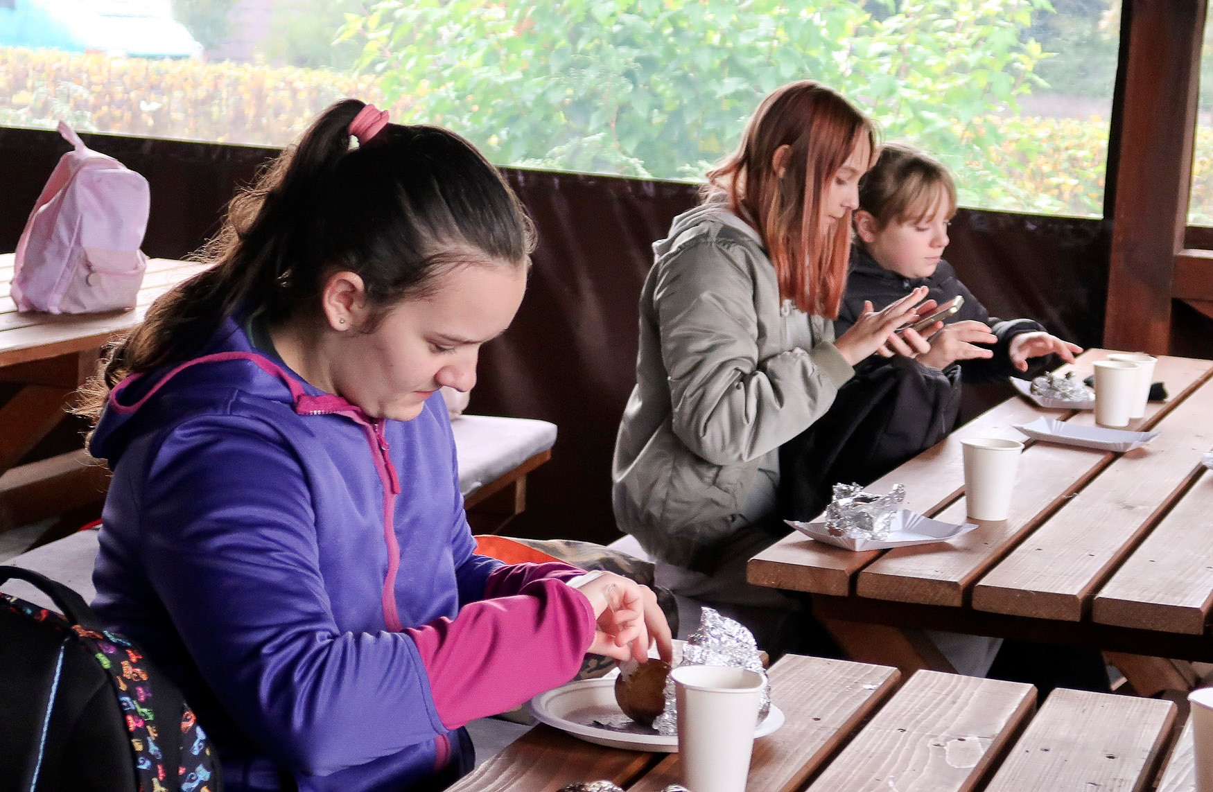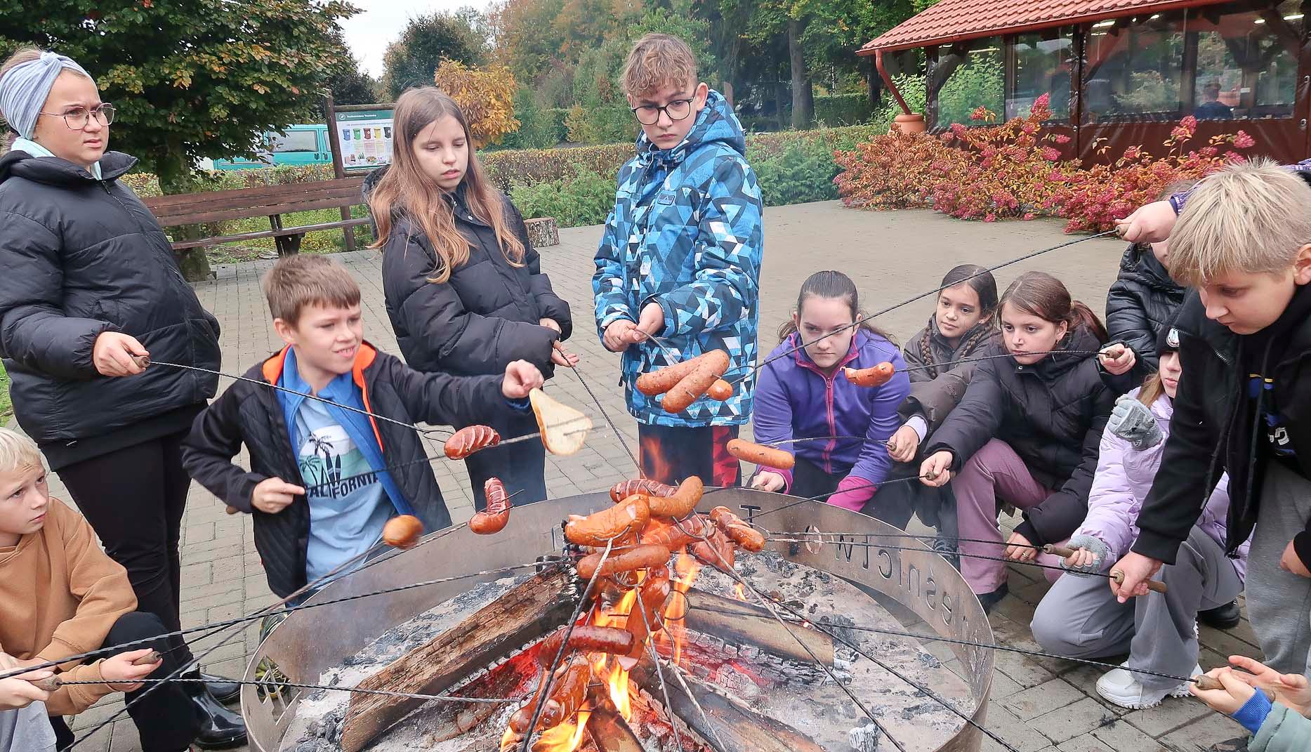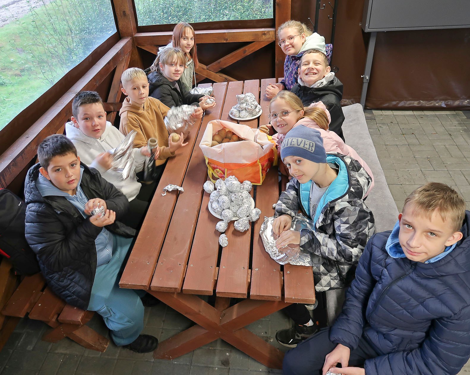 Druga grupa „Kucharzyki”, po zapoznaniu się z zasadami bezpieczeństwa i higieny pracy, zadbała o przygotowanie posiłków. Uczniowie przystąpili do zajęć praktycznych. Przygotowali ziemniaczane potrawy ogniskowe oraz upiekli kiełbaski.