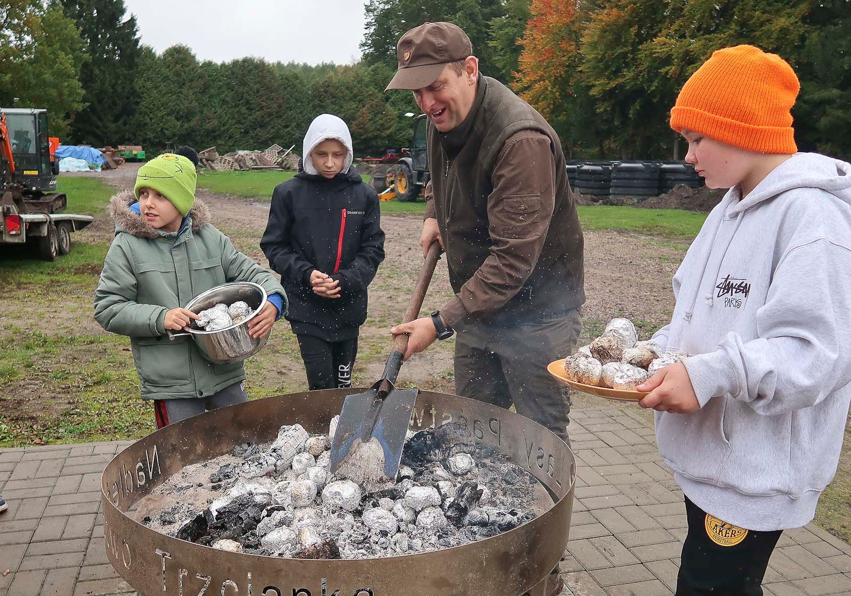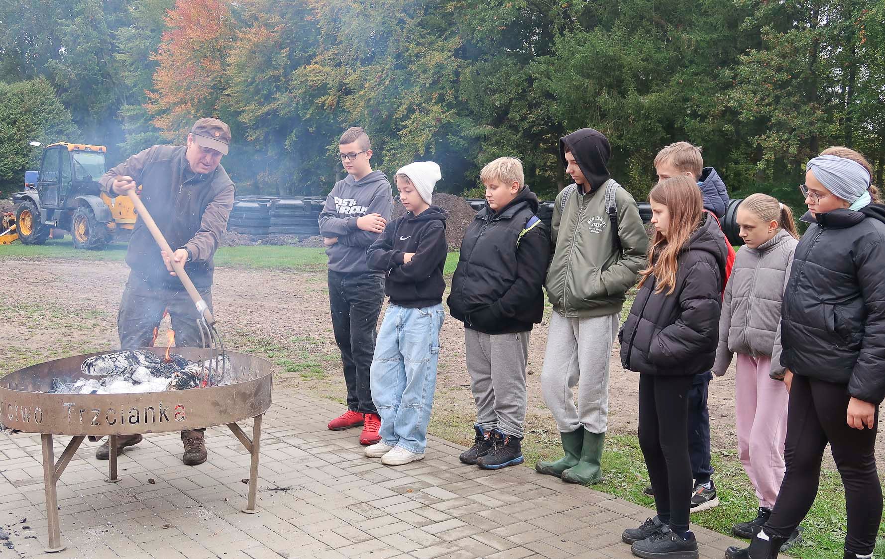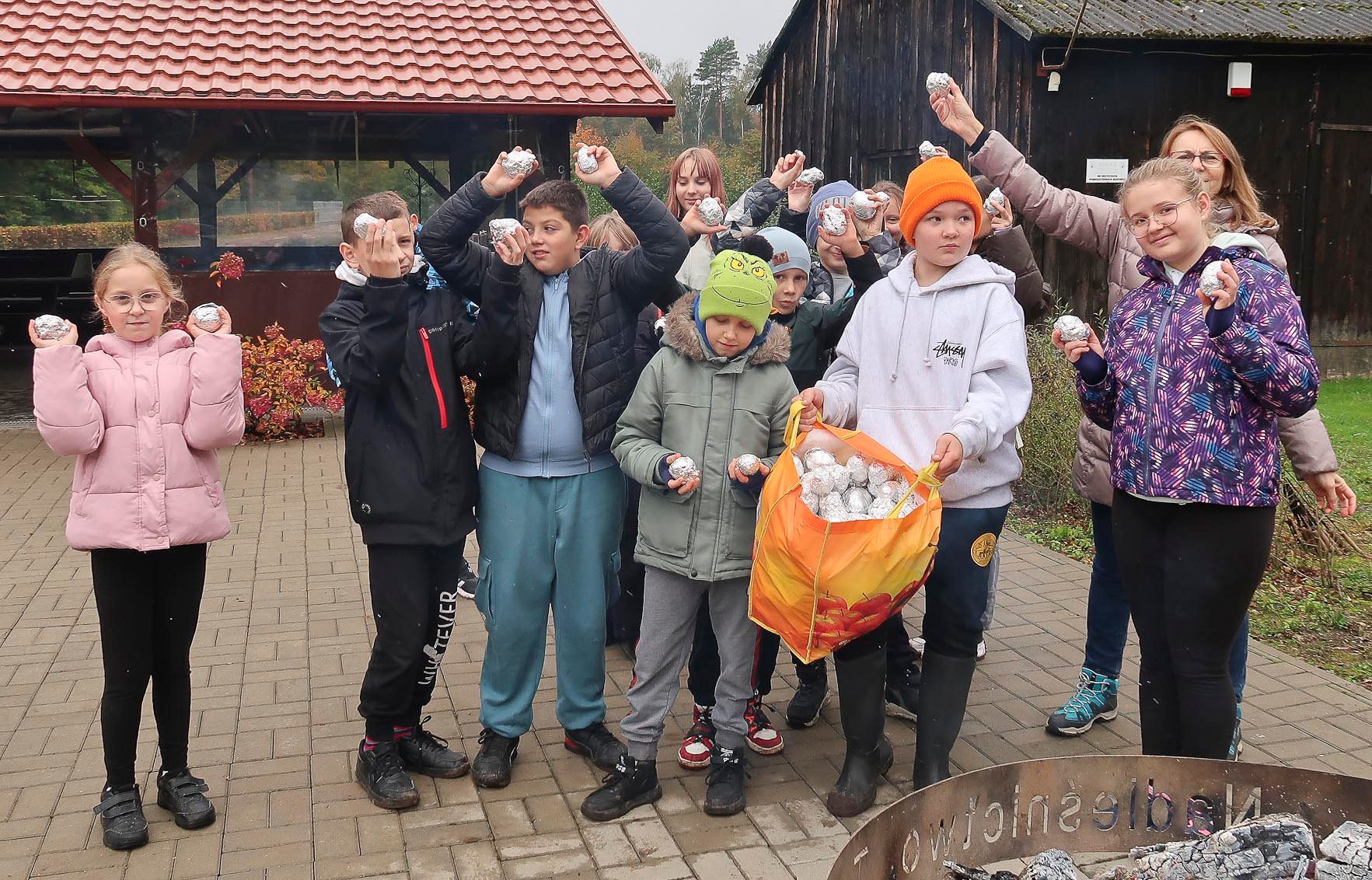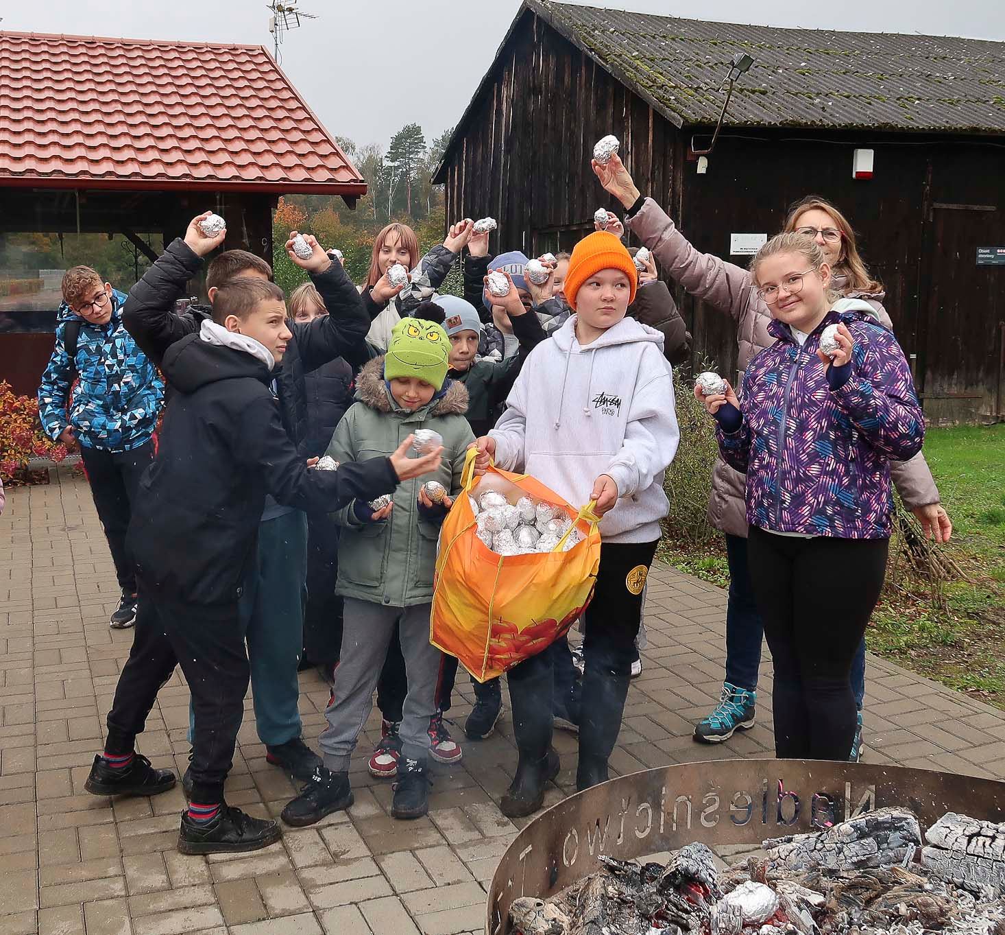 Druga grupa „Kucharzyki”, po zapoznaniu się z zasadami bezpieczeństwa i higieny pracy, zadbała o przygotowanie posiłków. Uczniowie przystąpili do zajęć praktycznych. Przygotowali ziemniaczane potrawy ogniskowe oraz upiekli kiełbaski.