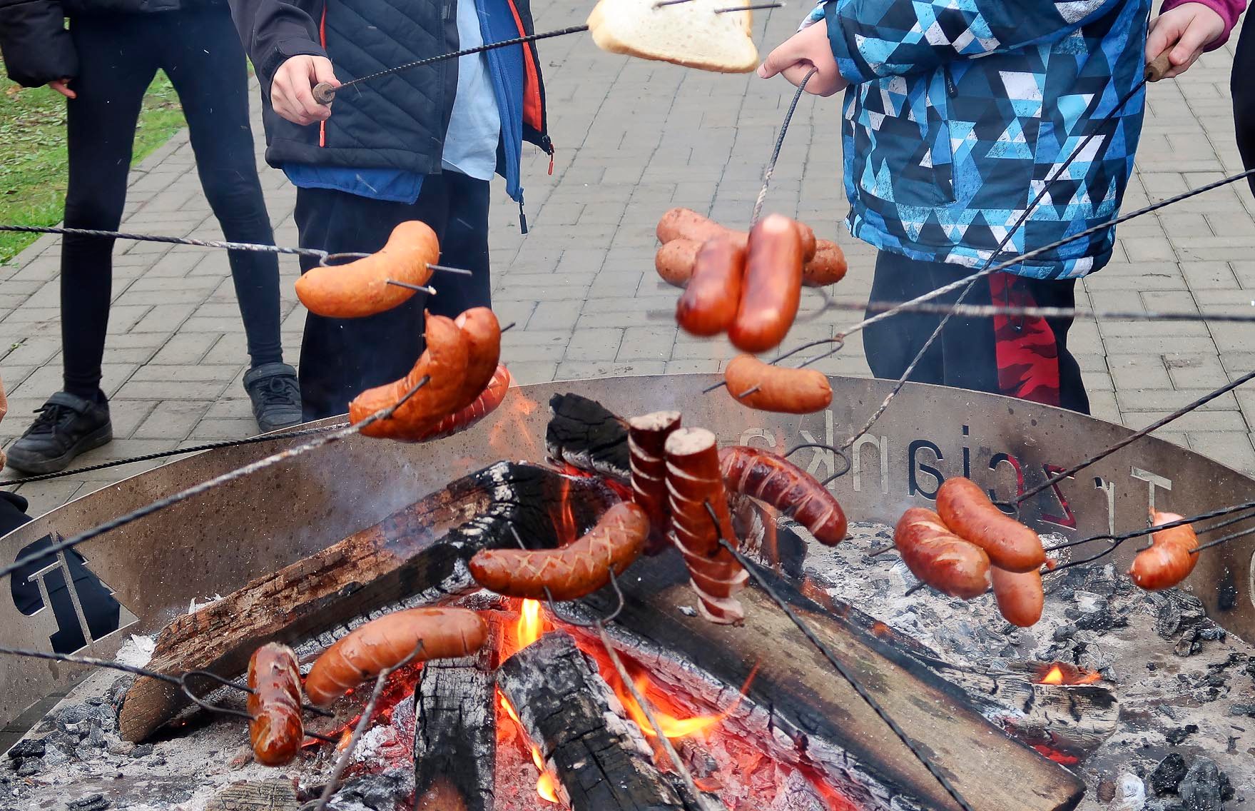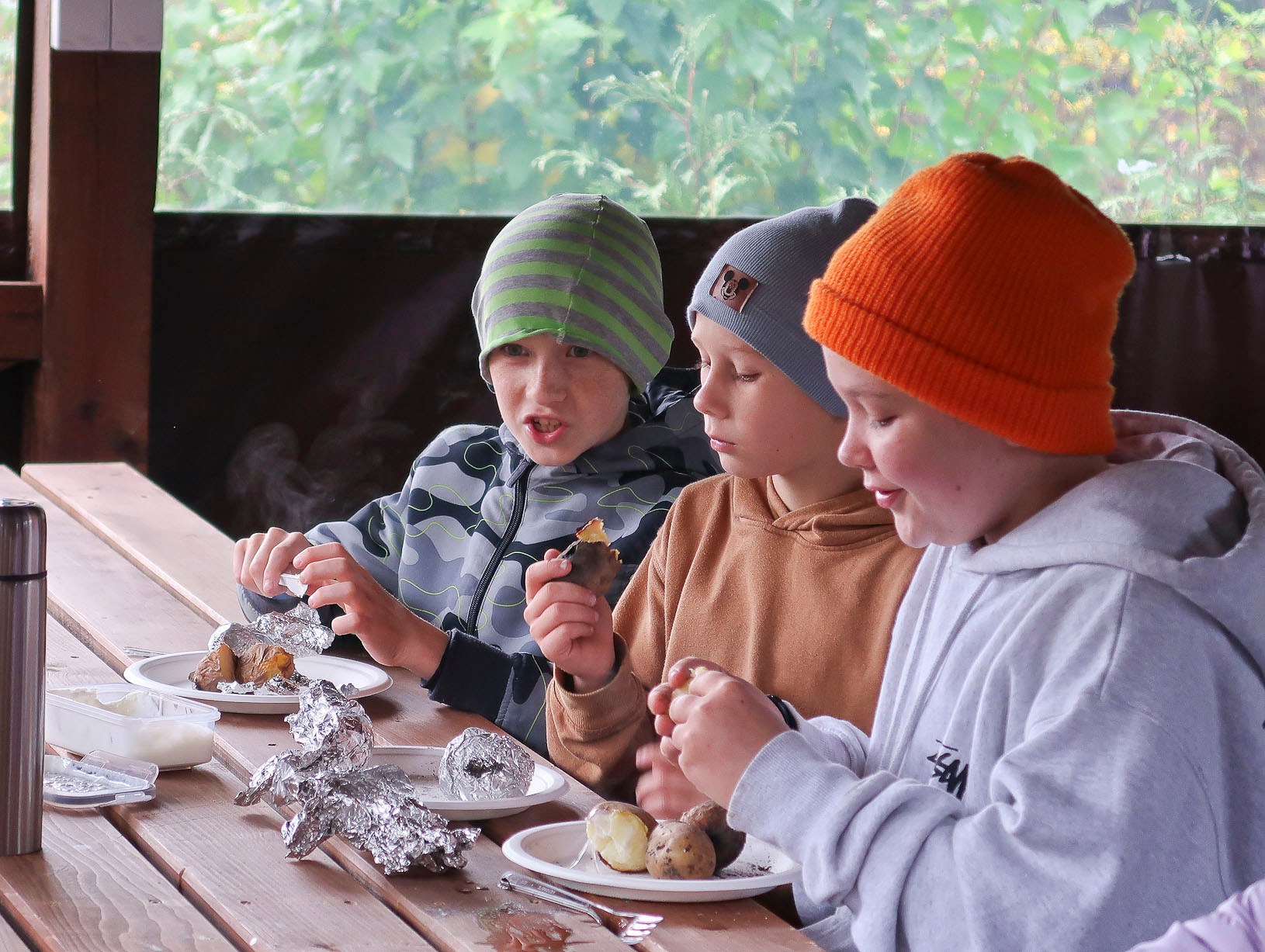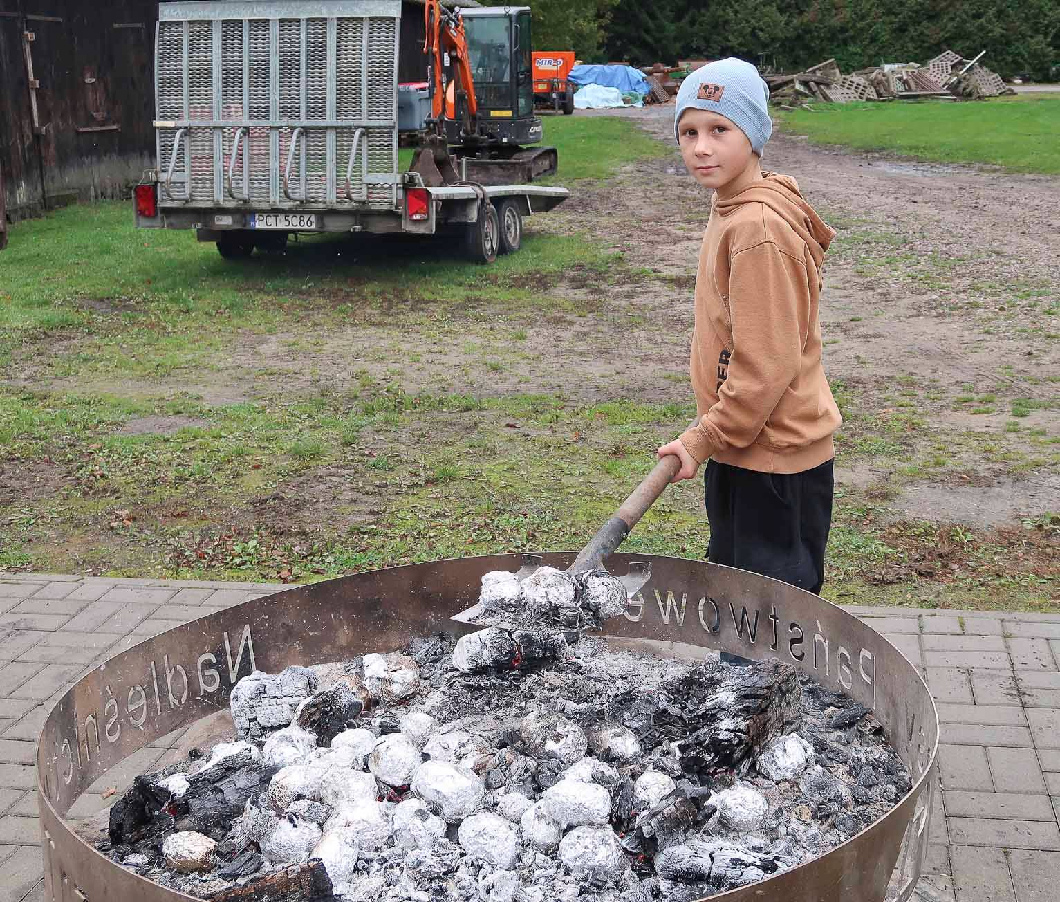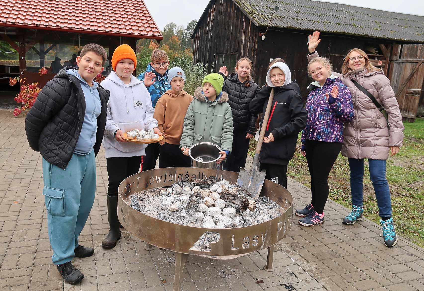 Druga grupa „Kucharzyki”, po zapoznaniu się z zasadami bezpieczeństwa i higieny pracy, zadbała o przygotowanie posiłków. Uczniowie przystąpili do zajęć praktycznych. Przygotowali ziemniaczane potrawy ogniskowe oraz upiekli kiełbaski.