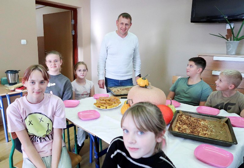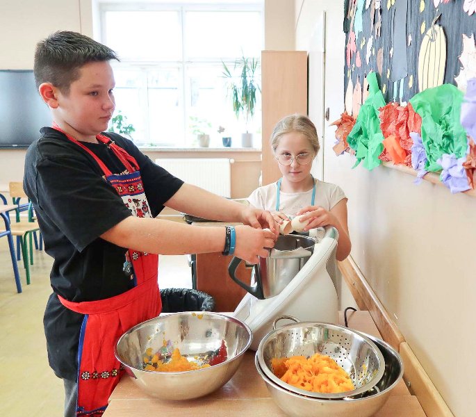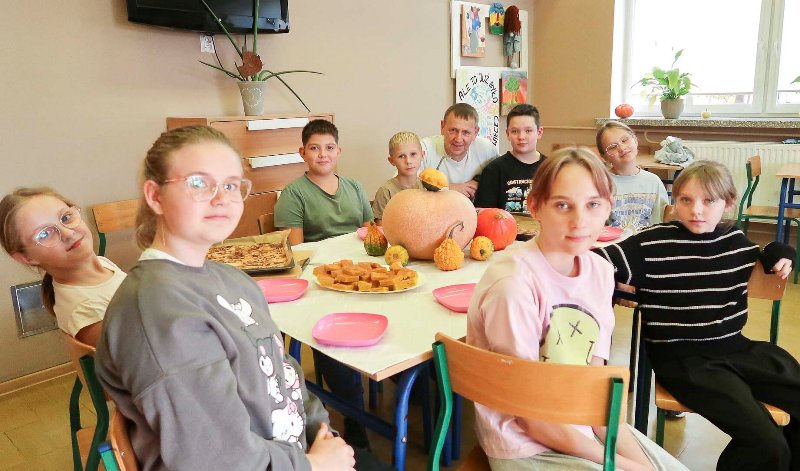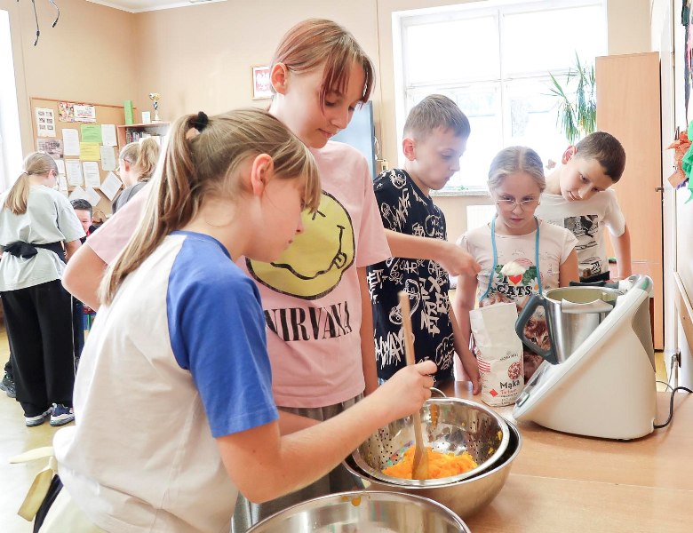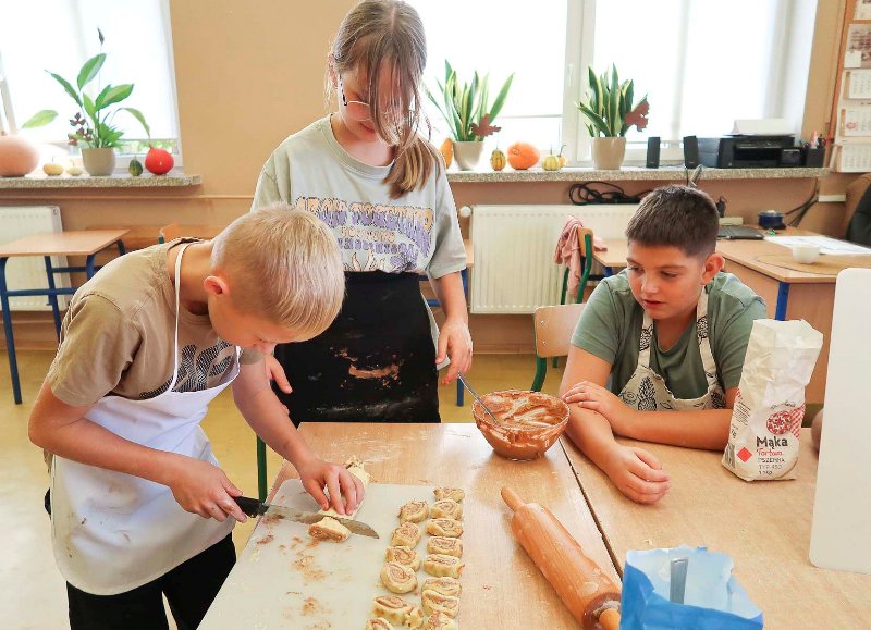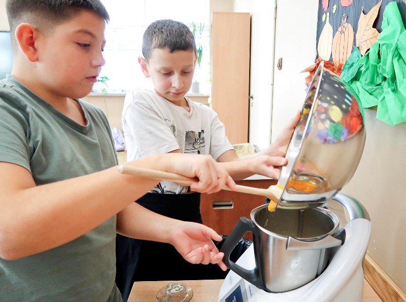 Nauka przez doświadczenie - uczniowie piekli ciasto dyniowe oraz ciastka cynamonowe. Mieli okazję eksperymentować z różnymi składnikami, poznawać nowe smaki, zapachy i tekstury. W trakcie przygotowywania potraw uczyli się między innymi jak łączyć składniki, jakie są ich właściwości i jak zmieniają się pod wpływem obróbki cieplnej. Tego rodzaju zajęcia praktyczne wzmacniają umiejętności społeczne i budują poczucie przynależności do grupy.